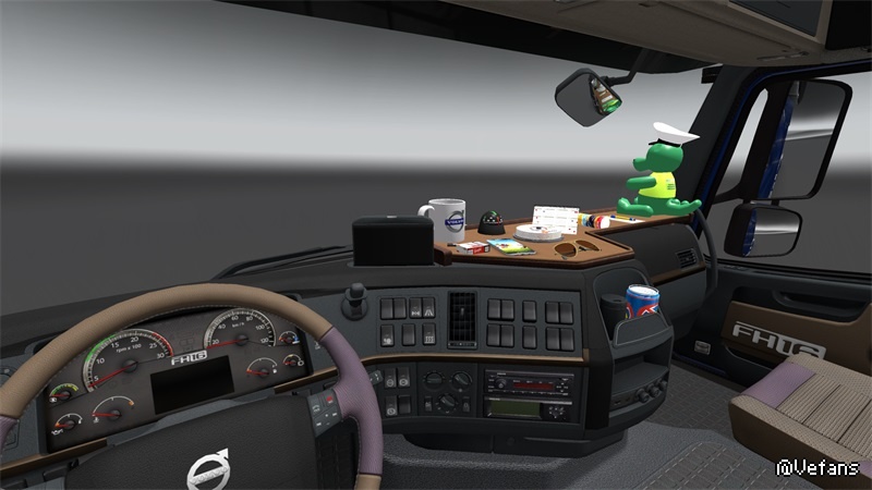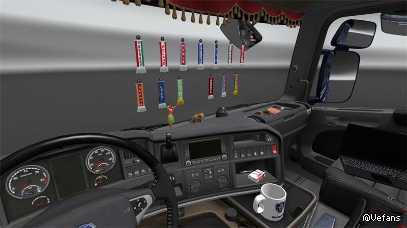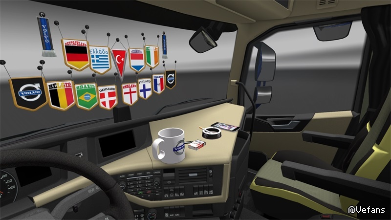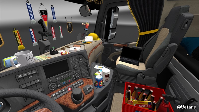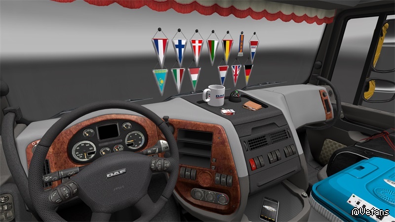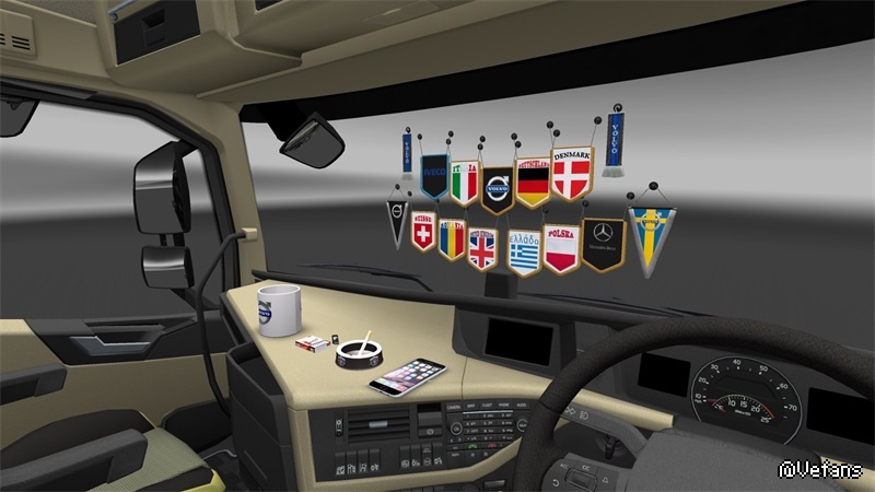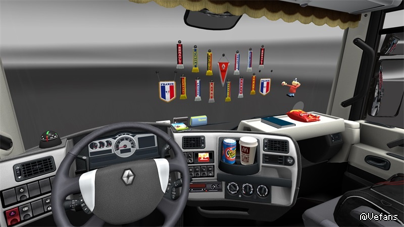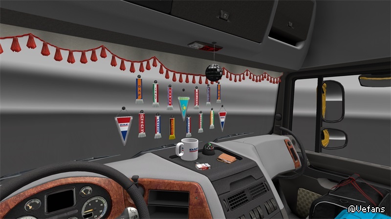 This mods add +/- 30 scarfs, +/- 30 pennants, several 3D objects, News slots glass for all trucks, new sets dashbord for all trucks, some trucks have new curtains, stickers on windows and glass, bed for some trucks.