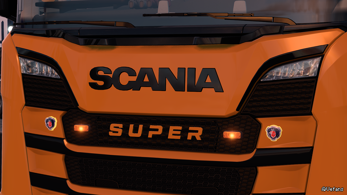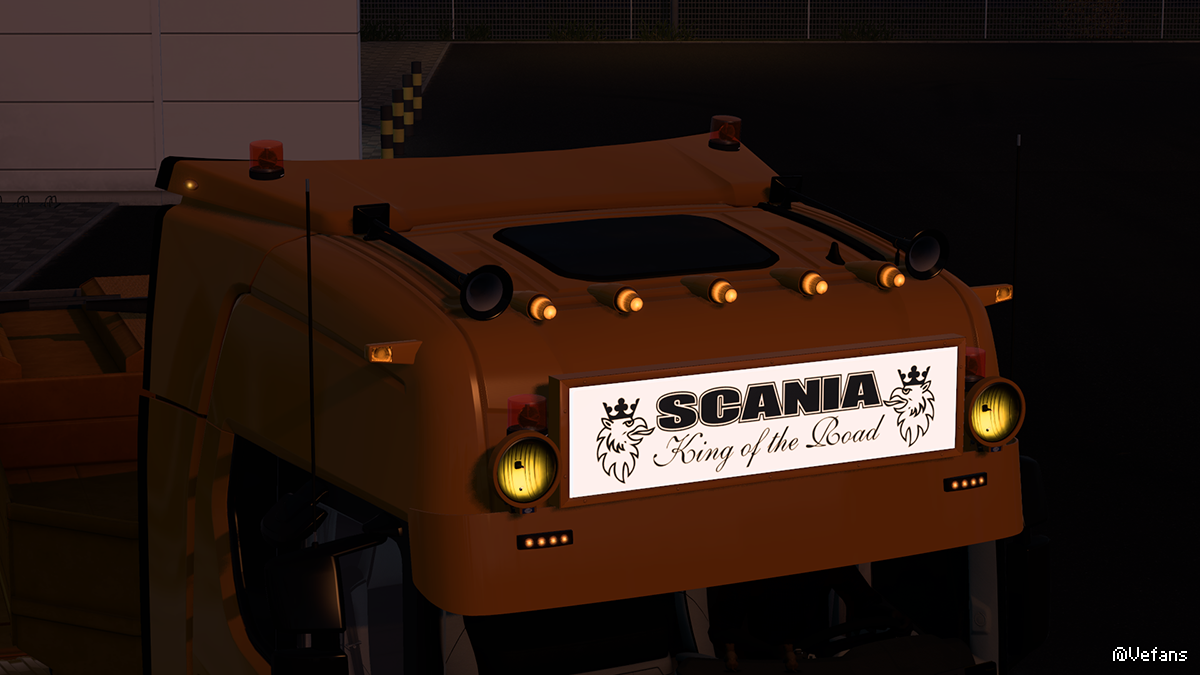 远光灯Pollux9、Castor7、Intense9;屋顶上的信标;屋顶上的必比登;海拉双燃烧器;镜子下的棒棒糖;侧标“Gylle”;沃尔沃顶灯(旧/新版本);鱼雷顶灯;遮阳板上的灯(仅适用于 Scania Next Gen);徽章(超级,贝塞尔等..);沃尔沃 F/FH 徽章,中冷器,V8;前挡泥板;拖车挡泥板(仅适用于 DLC Krone);格栅上的板(生态级、米其林、大陆)......