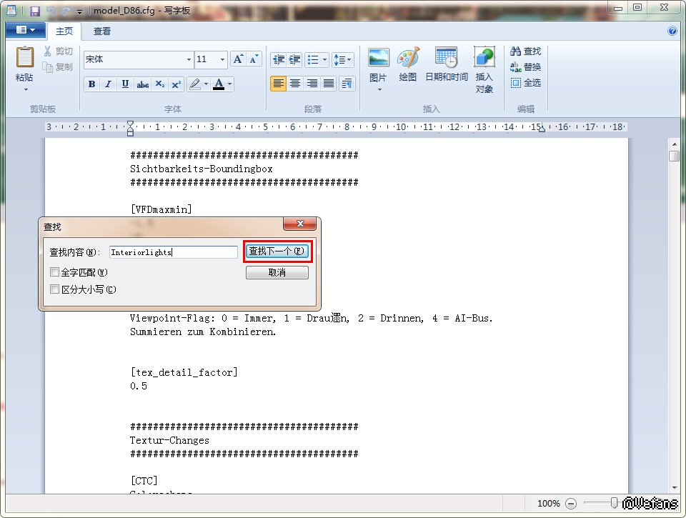 ②用 Ctrl+F 找到 Interiorlights,然后点击 查找下一个