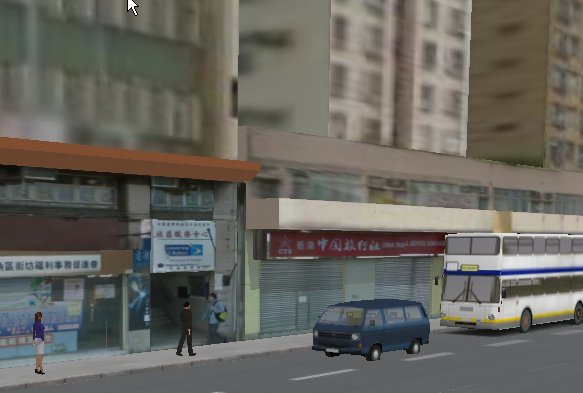 那個貼圖中的人, 是因為我整建築物時把貼圖整到一張近一張遠, 有人物這張是拉近了導致變大了, 而旁邊沒有人那棟中旅社是拉遠了距離, 剛剛好高過omsi裡的行人少少(指卷閘門口)(不計高了一級的地台), 搞到兩棟的比例不對