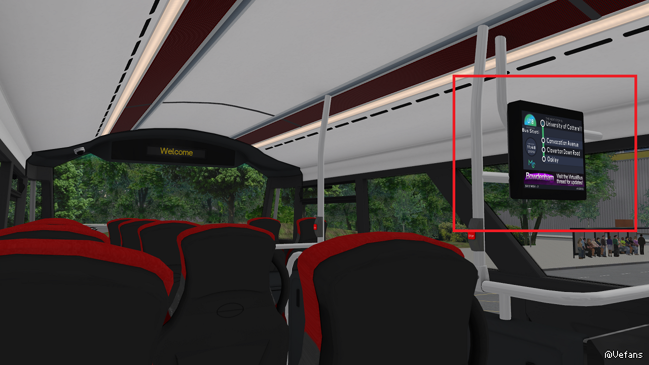 「報站」功能在這部車輛掛上時間表後會在新款售票機屏幕及車廂電視中自動顯示,但不能播出聲音或手動控制。