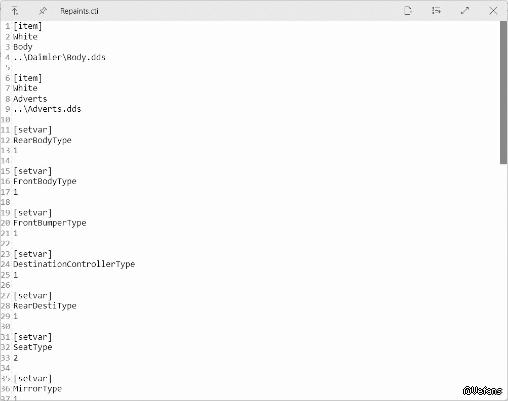 在*/Texture/repaints/.../*.cti里面按涂装进行修改