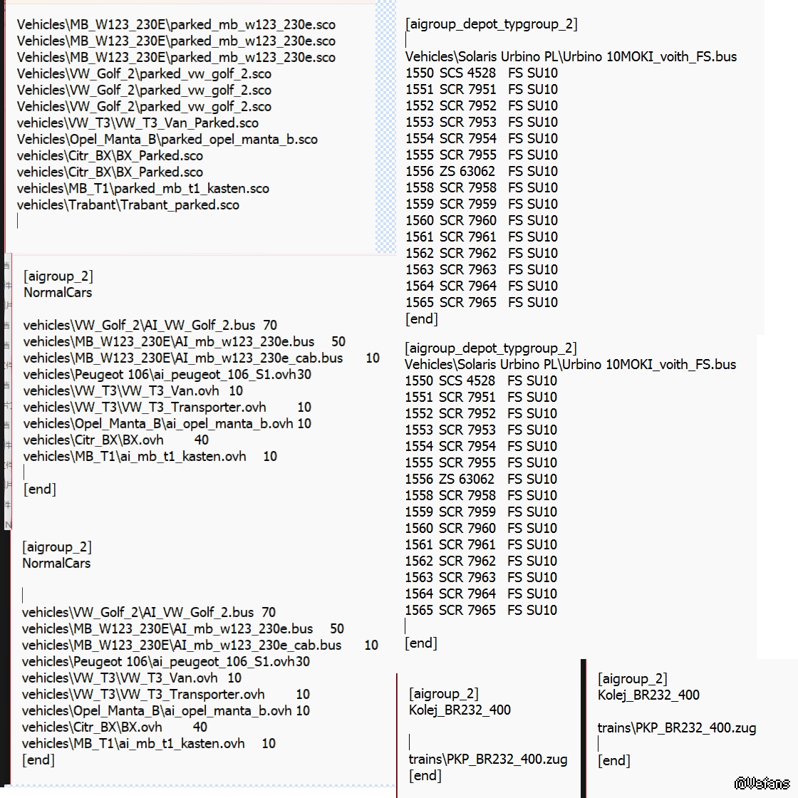 由于是create vehicle invalid,推测在ailist.cfg或parklist_p.txt中引入了空行。请自查一下文件各部分,如各AI组内、parklist_p.txt底部是否有多余的空行。以下为错误示范,光标位置不应存在空行: