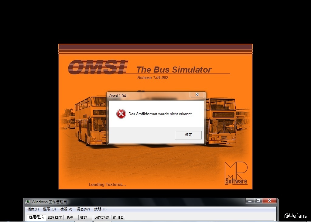 但近來可能我調較過OMSI 的GRAPHIC 設置, 現在無法載入Great Grundorf 2.每次載入至LOADING TEXTURES 時, 它出現一個德文的警告字, 但按ENTER鍵, 不能清除警告, 不斷按下,它仍依然存在. (請見圖1)
