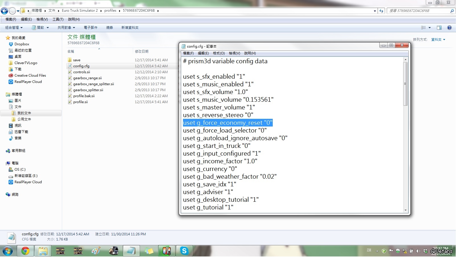 1. 在Documents\Euro Truck Simulator 2\profiles\[你的profile]中找出config.cfg並用notepad打開