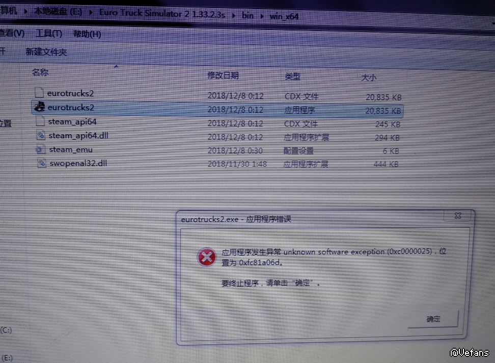 如题 1.33.2.3s刚早上安装了 找到bin win64 双击应用程序 还是进不去 提示 应用程序发生异常 unknown software exception(0xc0000025),位置为0xfc81a06d. 我电脑是win7 64位的