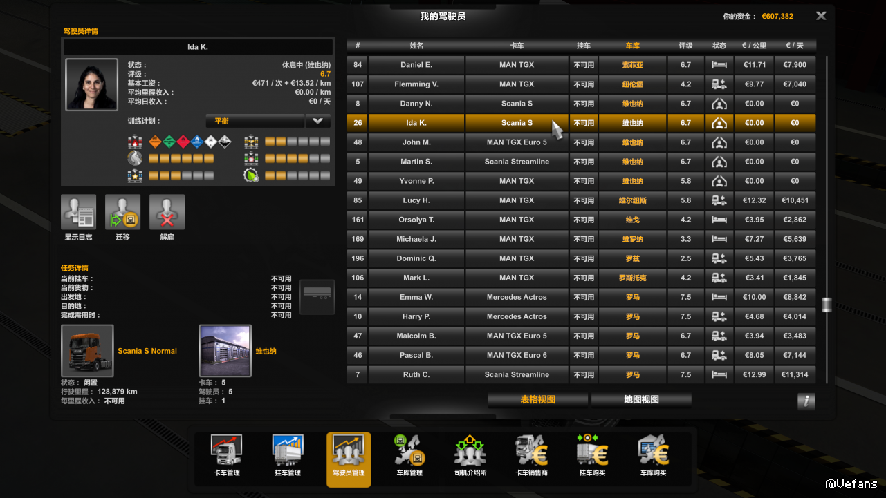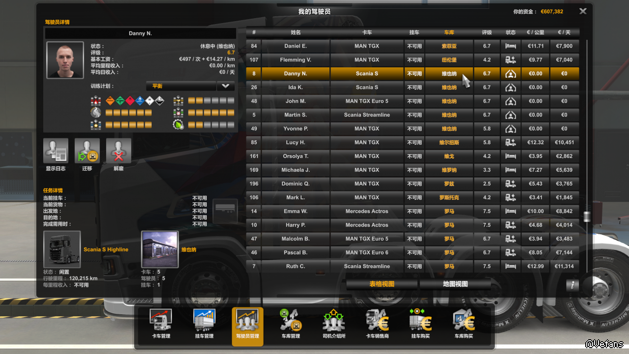 维也纳以前效率都是100%了,有MAN,有斯堪尼亚,那个MAN TGX还是我以前自用的,不知道怎么回事突然司机一直都在休息中,七天收入都是零