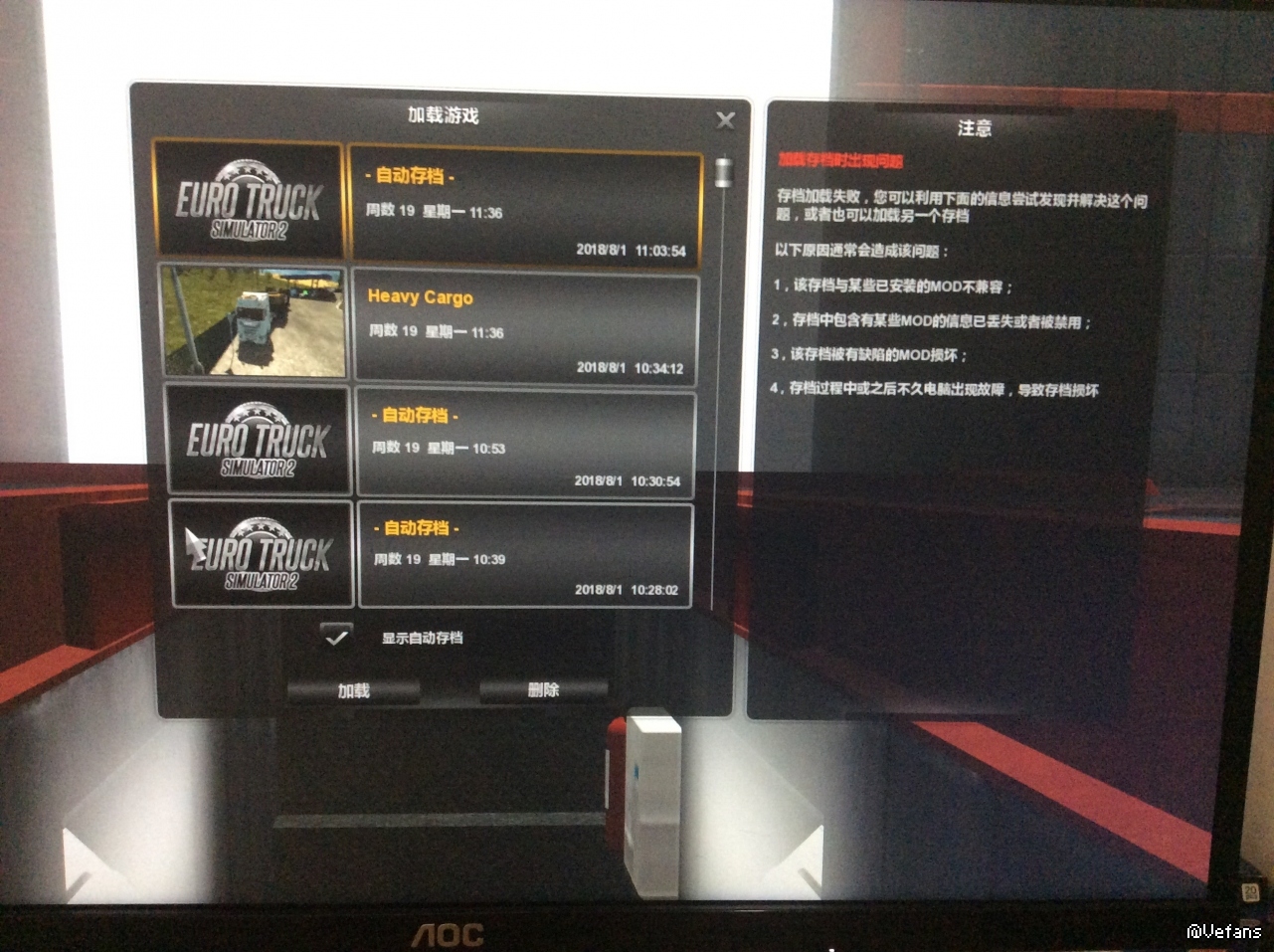 证明你加的mod里其中一个会引起游戏崩溃,这样没办法,只能一个个加载着试,看哪个mod会这样就不要它了,找到那个mod后不加载他然后加载游戏有这个画面就点击加载,然后就能读档了