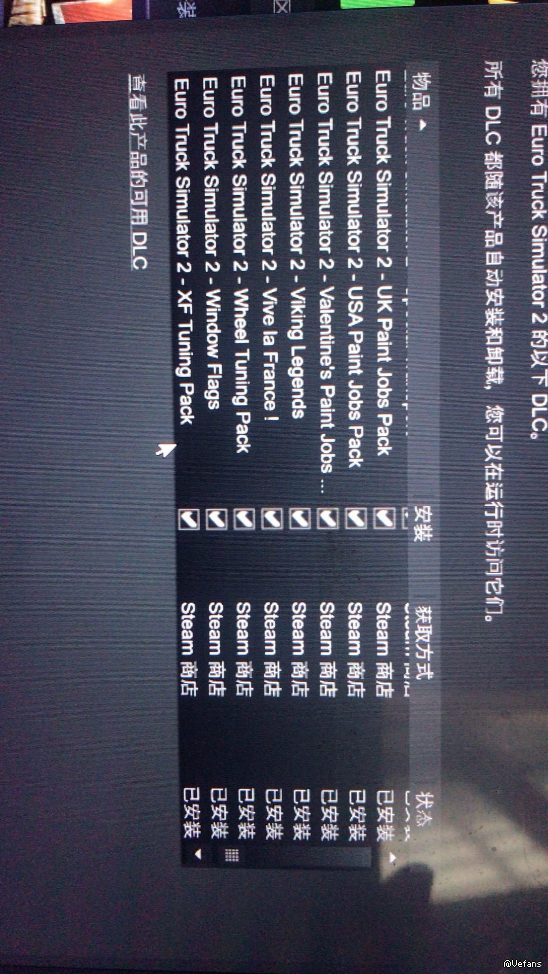 我吧欧洲卡车2的DLC 基本上全买了,steam也显示安装了,我也检测文件了,进入游戏怎么就是显示不了啊。。。。