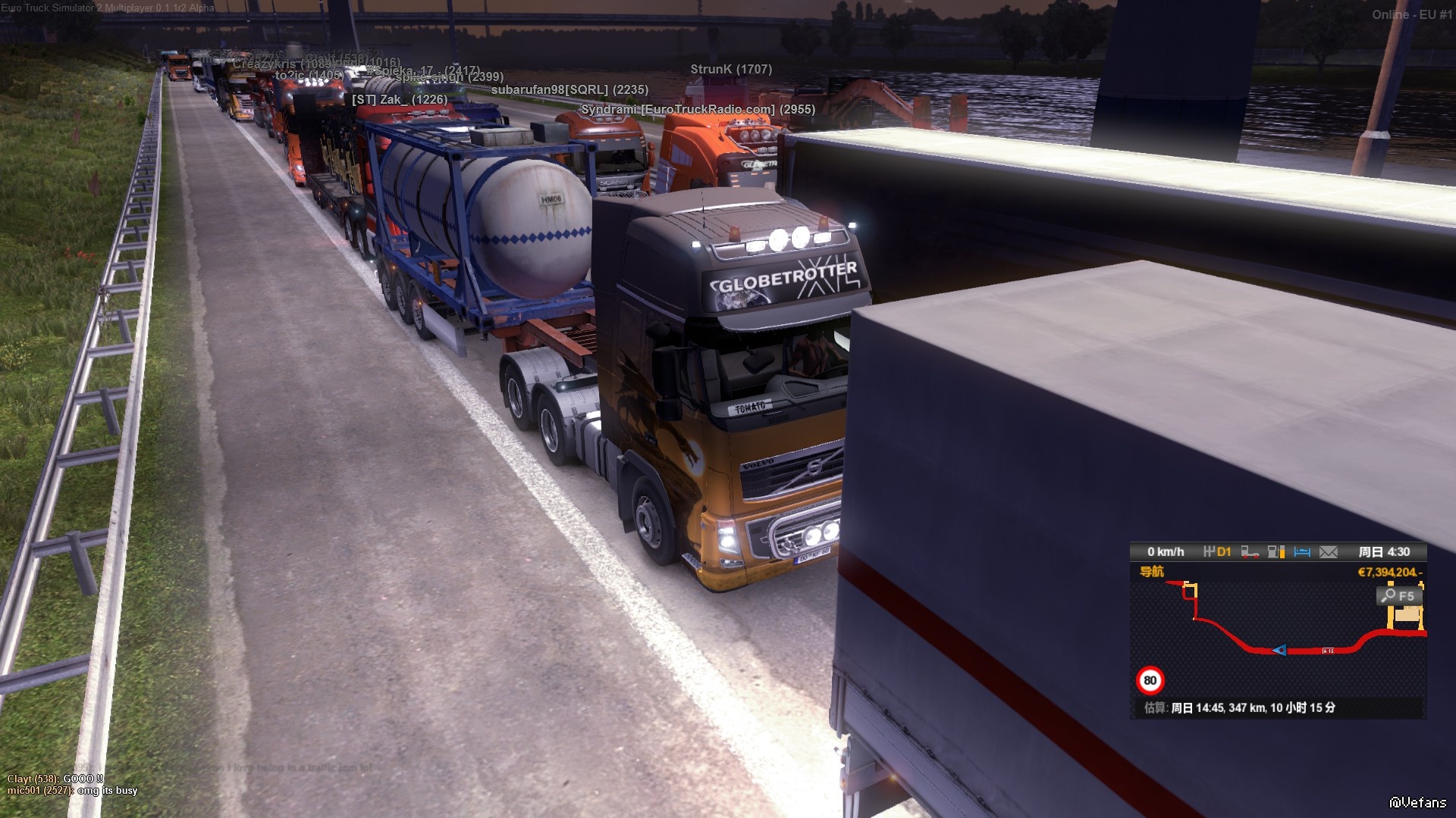 狂lag,仅10fps,估计有上百辆卡车在这里堵着呢,也不知道前面发生了什么,后来实在等不及就f7回去了,呵呵