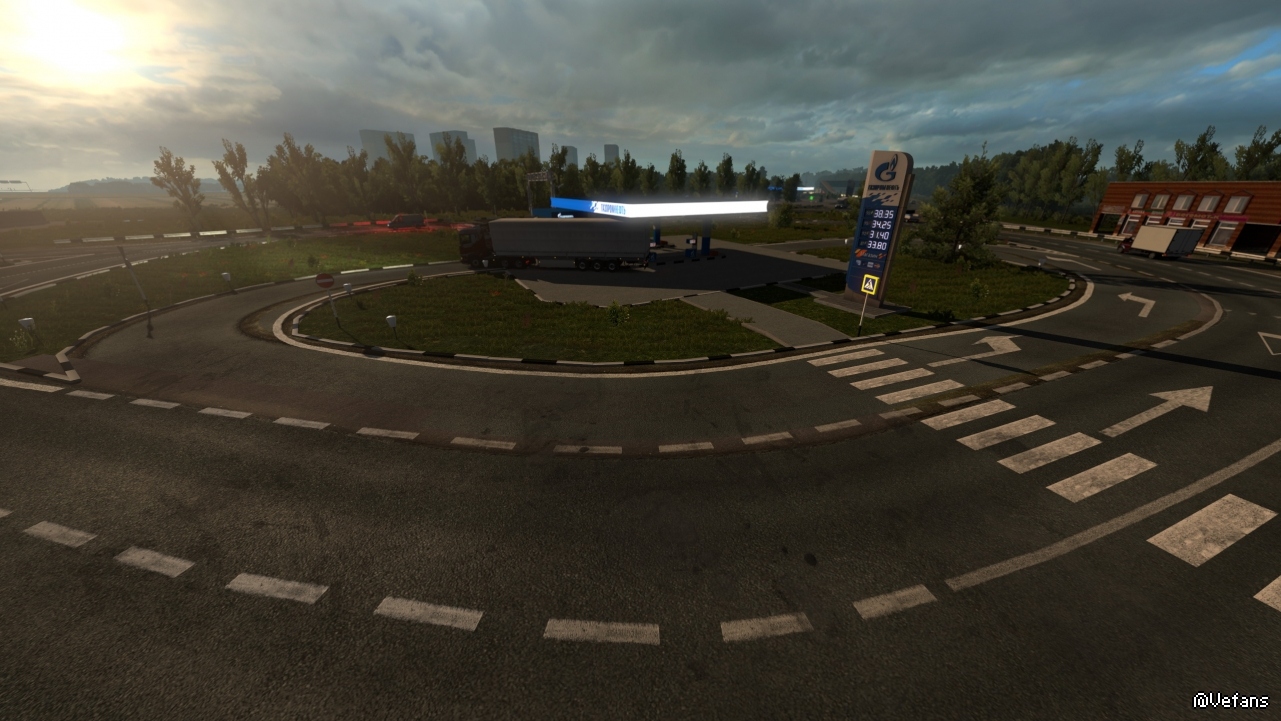 环岛中间有个加油站,这种格局我在欧卡2里是第一次见(话说我是被骗进去的,我想在环岛处掉头,却意外地驶进了这个加油站,结果出来的时候让车让了很久,因为战斗民族的司机不给我让行)