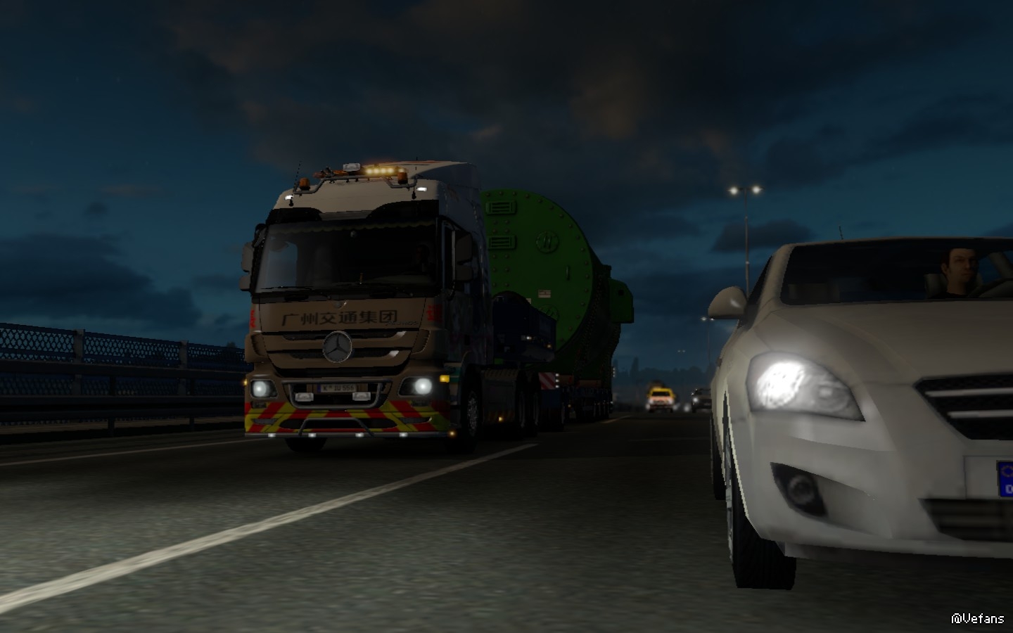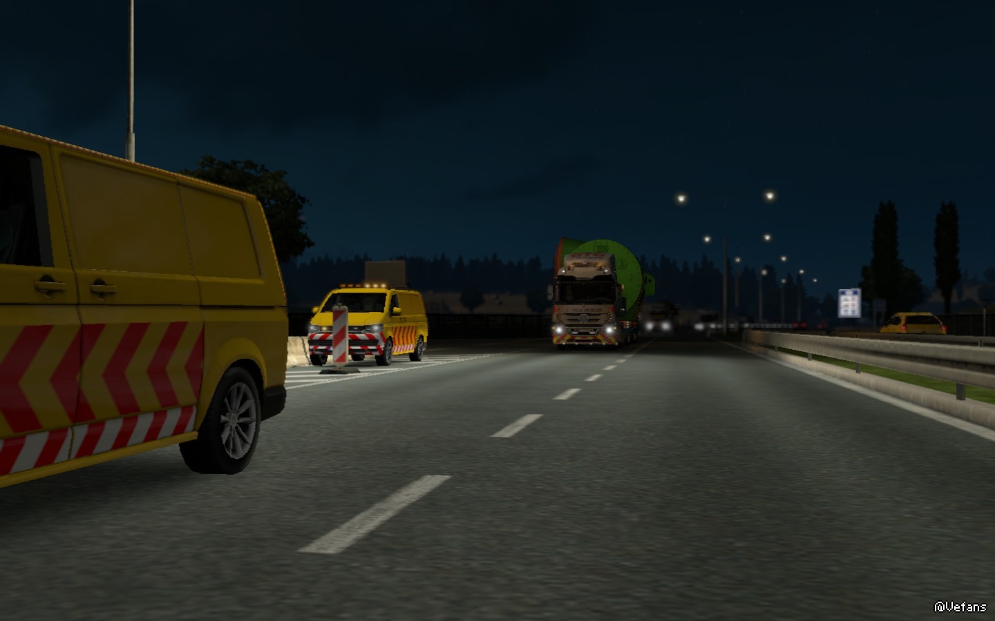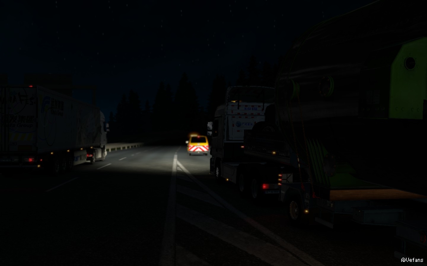 已经到了午夜时分,车辆在高速路以每小时60KM左右的速度行进中,我有条不紊的跟着引导车,因为货场工作人员说过:引导车是保障货物的安全才使用的,所以务必跟随着引导车前进! 而隔了一段路的路旁还有工作车竖起指引牌引导车辆。