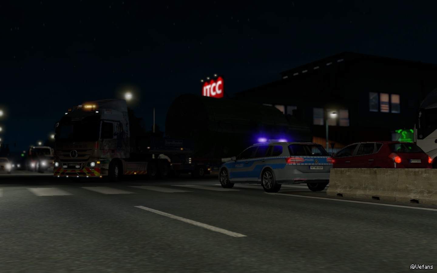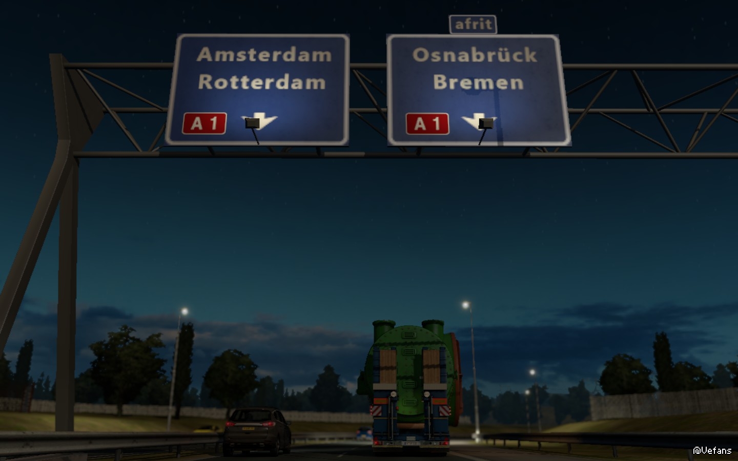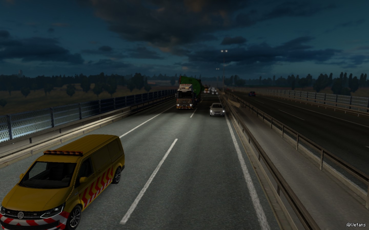 已经到了午夜时分,车辆在高速路以每小时60KM左右的速度行进中,我有条不紊的跟着引导车,因为货场工作人员说过:引导车是保障货物的安全才使用的,所以务必跟随着引导车前进! 而隔了一段路的路旁还有工作车竖起指引牌引导车辆。