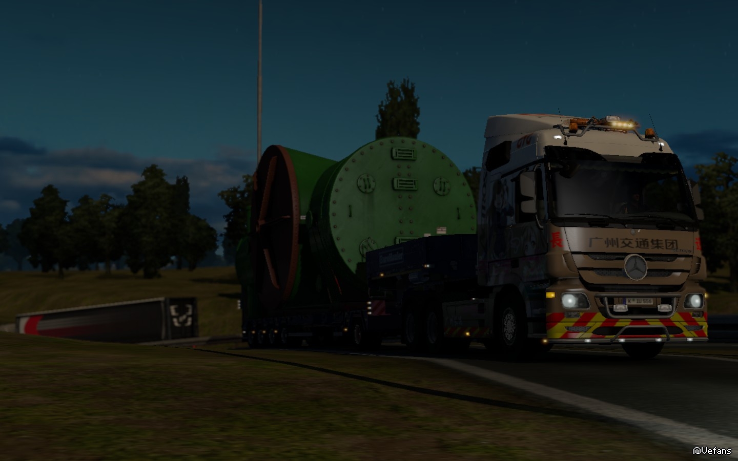 沃的天啊,我居然这么倒霉,要去拉大件,不过算了,公司特意把我派去执行任务,一定有他们的原因,说不定他们看得起我呢。我把工作服换好,到停车场发动那辆新的K·IU 556号奔驰Actros MP3,这辆车是上个月底买的,中顶驾驶室配551马力发动机,12+2变速箱,6×4驱动,再配上我这个拥有国内A2驾照(