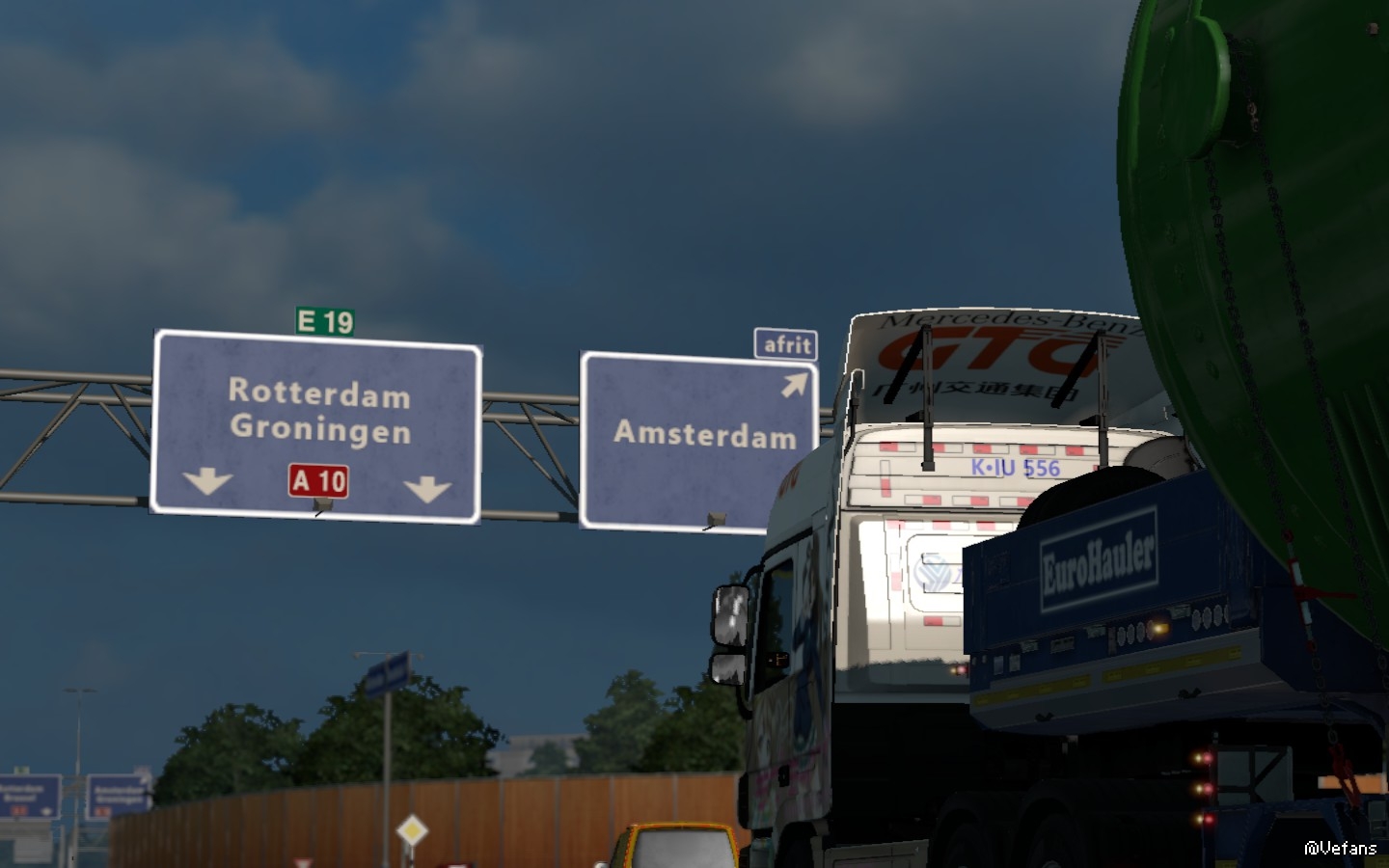 车辆行驶了约半个小时,从某入口进入往阿姆斯特丹的高速公路,在上坡时,车速不断降低,马上我就切换为低速档爬坡,经过一番努力,车辆终于带着几十吨的大家伙爬上来了,而引导车则在前面等候。