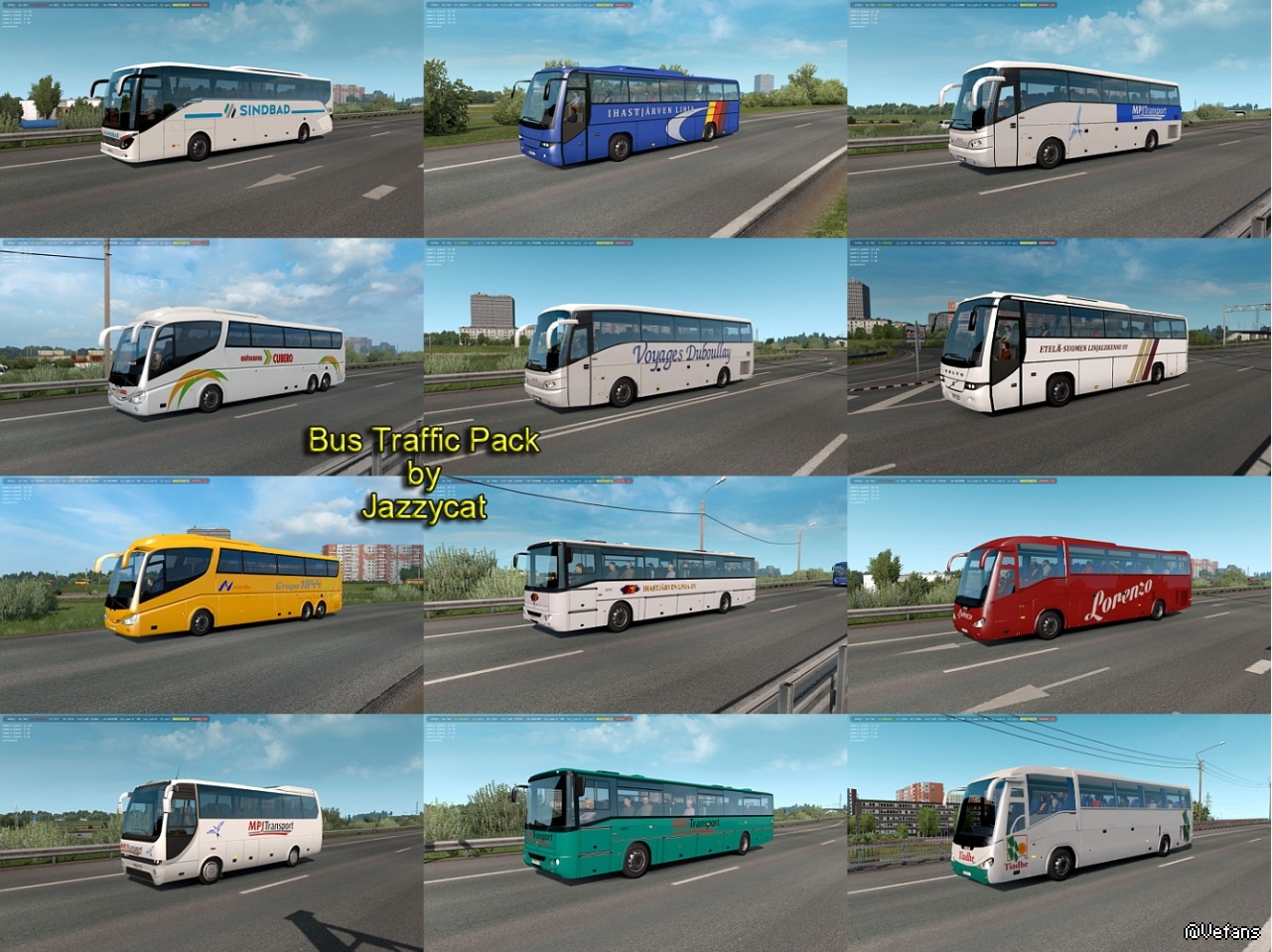 Pack adds in traffic 37 new models of buses with 969 skins (Setra, Neoplan, Volvo, Man, Mercedes-Benz, Ikarus, Ayats, Irizar, Scania, Temsa, Jelcz, Karosa, Caetano).