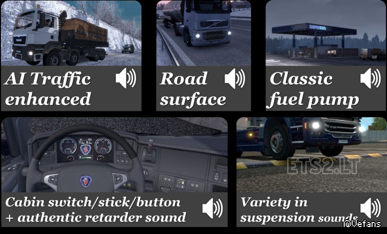 *更多的变化和增强的模拟悬架的声音。有了默认的声音,你只会获得暂停轮胎,但与此国防部你得到的客舱,拖车和轮胎的暂停声音