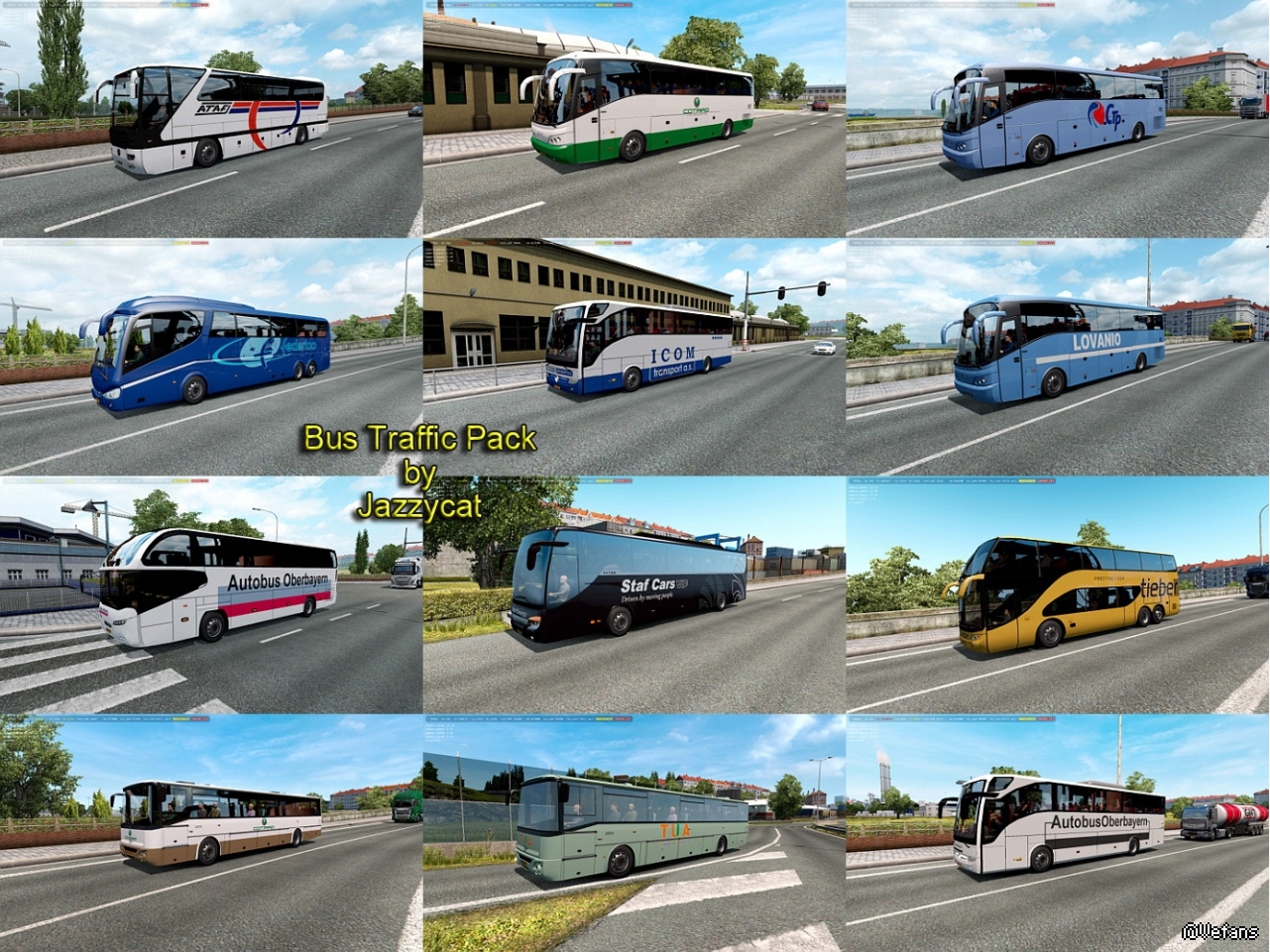 Pack adds in traffic 37 new models of buses with 923 skins (Setra, Neoplan, Volvo, Man, Mercedes-Benz, Ikarus, Ayats, Irizar, Scania, Temsa, Jelcz, Karosa, Caetano).