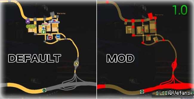 修改隐藏城市中的所有图标。只有道路编号仍然在路上。修改会更改发现的路径的透明度。未被发现的道路是红色的。