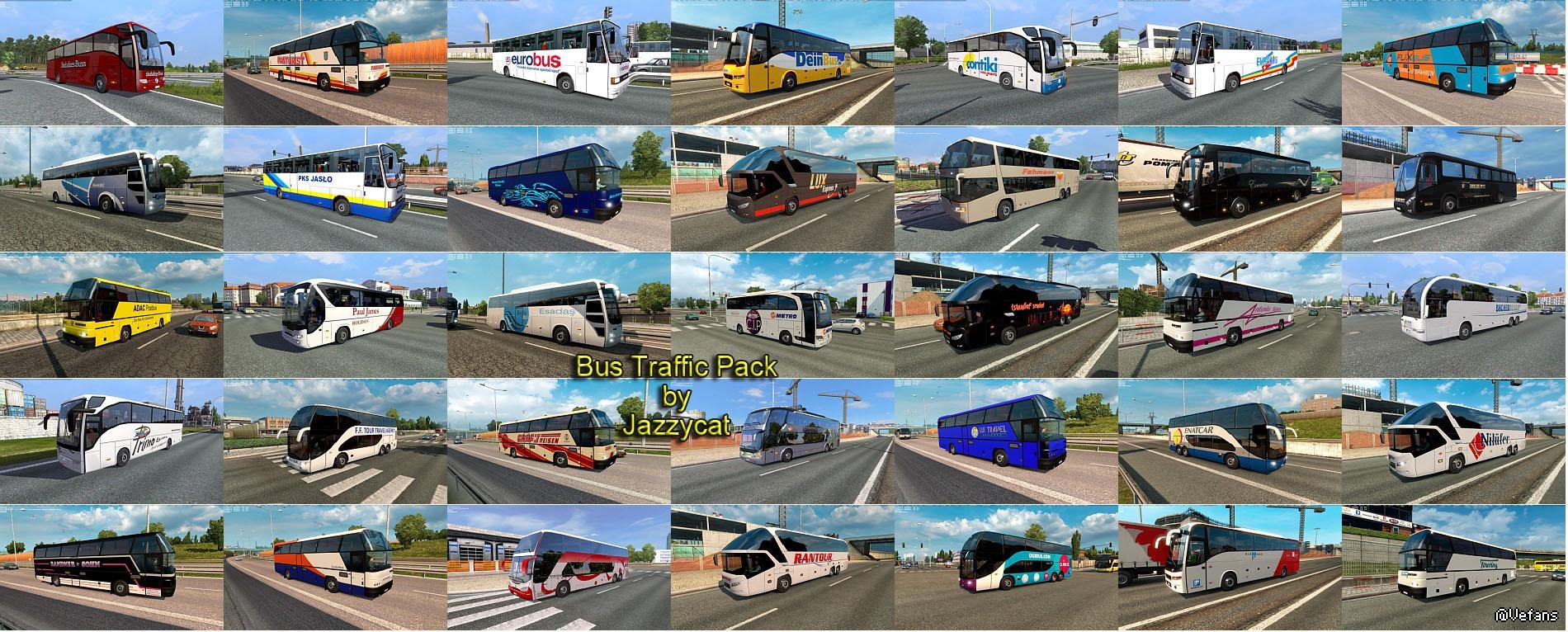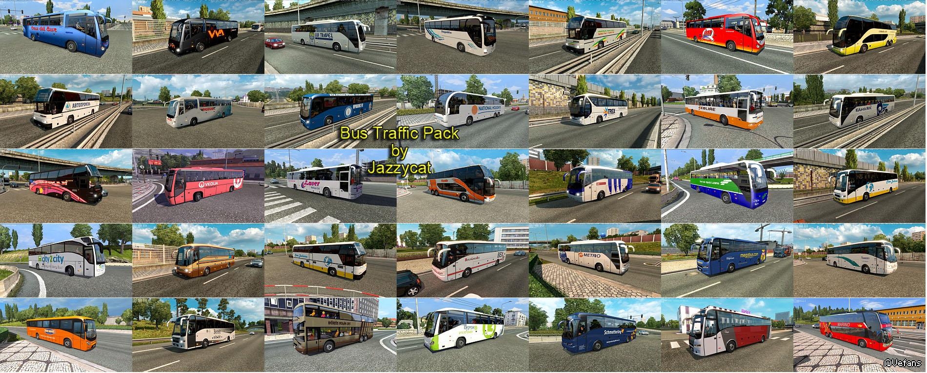 Pack adds in traffic 27 new models of buses with 324 skins (Setra, Neoplan, Volvo, Man, Mercedes-Benz, Ikarus, Ayats, Irizar, Temsa, Jelcz, Caetano).