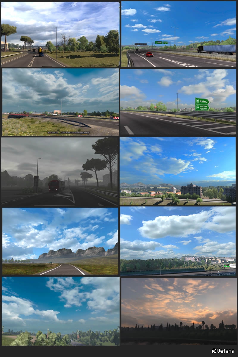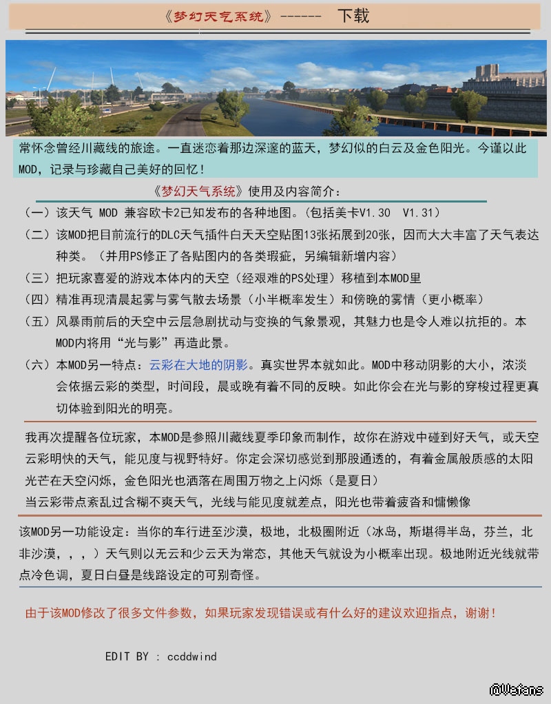 此MOD支持欧卡2所有地图,此天气MOD完全兼容(欧卡2,美卡)V1.30 V1.31 版本