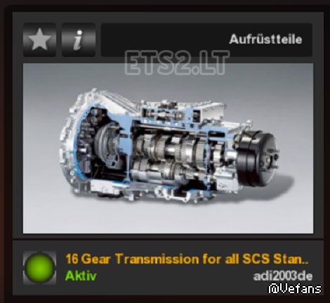 This mod adds all SCS Standard Trucks a 16 gear transmission Ecosplit a is composed of 8 solid transitions and each one overdrive Split .