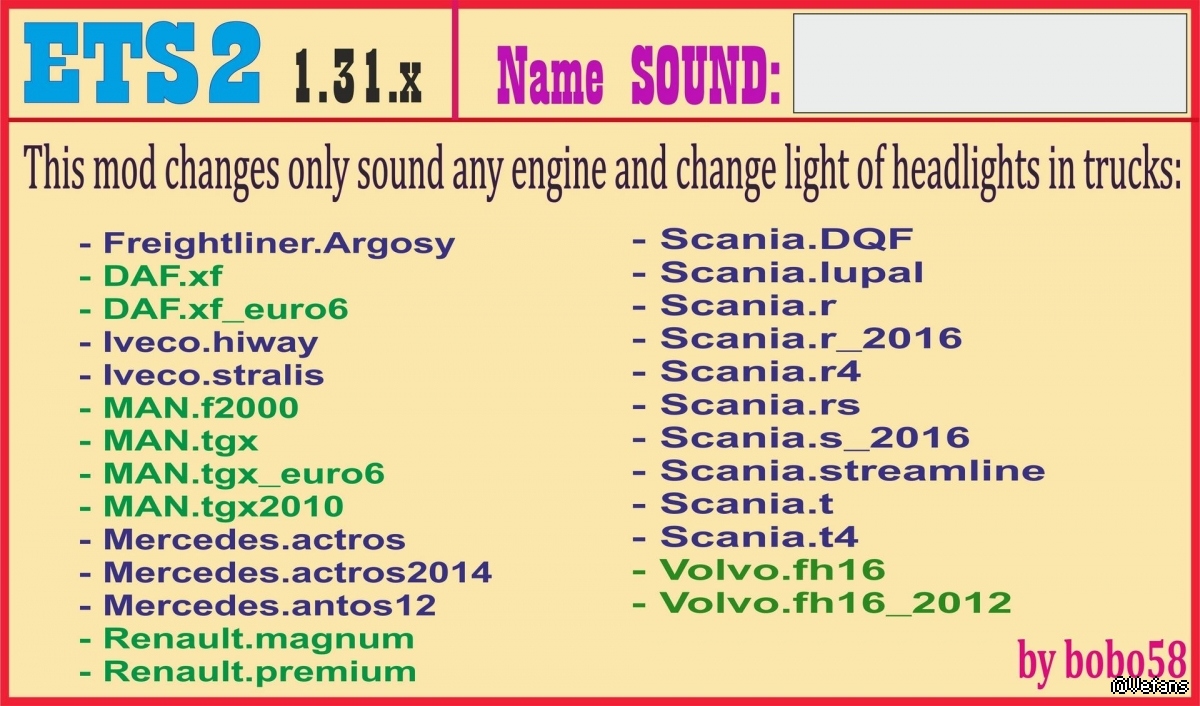 These mod replace the sound of any engine and light of headlight in trucks: