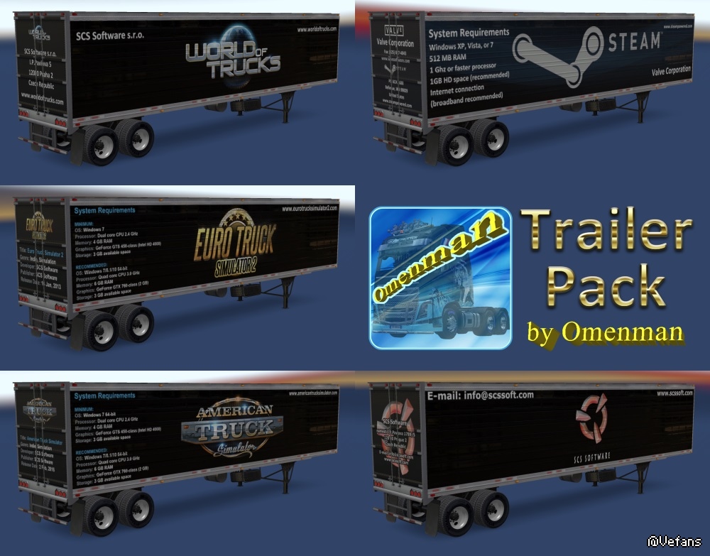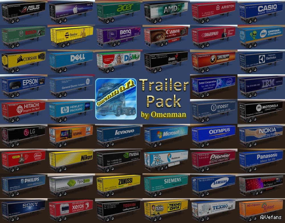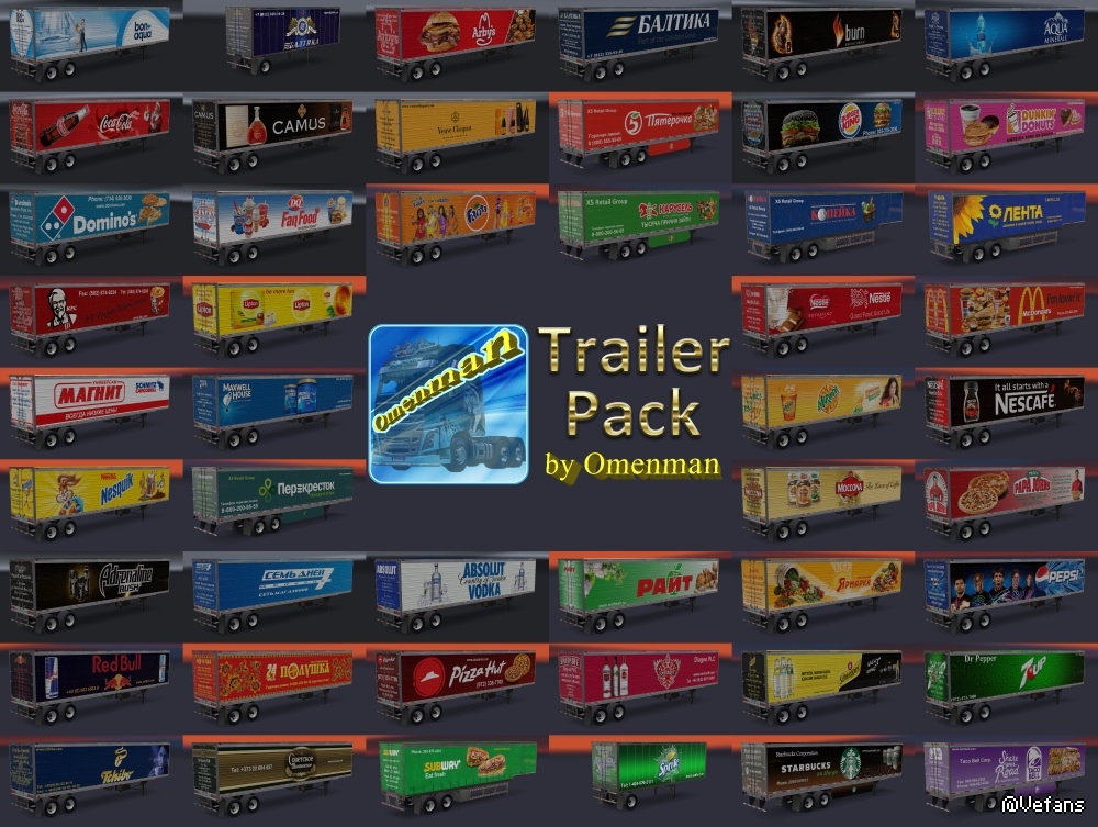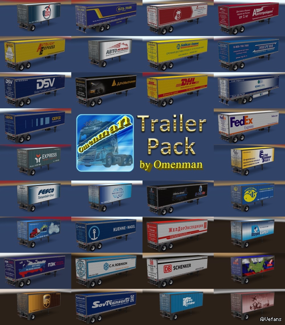 Big package of the trailers with skins from Omenman. In the package 41 company, 70 cargo and 311 skins on 6 trailers (Box, Curtain, Reefer, Reefer3000r, Gas and Acid). This package merges 9 thematic mods and 2 trailers: – Trailer Pack Cars ver.1.02.00 (50 trailers) – Trailer Pack Clothing ver.1.02.00 (19 trailers) – Trailer Pack Electronics ver.1.03.00 (50 trailers) – Trailer Pack Foods ver.1.03.00 (48 trailers) – Trailer Pack Fuel ver.1.02.00 (12 trailers) – Trailer Pack Games ver.1.01.00 (5 trailers) – Trailer Pack Geographic ver.1.02.00 (63 trailers) – Trailer Pack Logistic ver.1.04.00 (32 trailers) – Trailer Pack Stars ver.1.04.00 (30 trailers) – Trailer “Omenman” ver.1.03.00 – Trailer “Istok” ver.1.03.00 Changes in version: 1. Added trailer “Istok” 2. Added 10 trailers from mod “Trailer Pack Foods 1.03.00”: – Starbucks – Subway – Taco Bell – Karusel – Kopeyka – Lenta – Perekrestok – Polushka – Pyaterochka – Yarmarka In the archive 2 files: 1. Base: trailer_pack_by_omenman_xxxxxxx.scs 2. English version of cargo: cargo_pack_by_omenman_eng.scs Modload order: cargo_pack_by_omenman_eng.scs trailer_pack_by_omenman_xxxxxxx.scs For the Russian version, connect only file the base. All trailers are autonomous and included in the traffic. For version 1.28 - 1.31