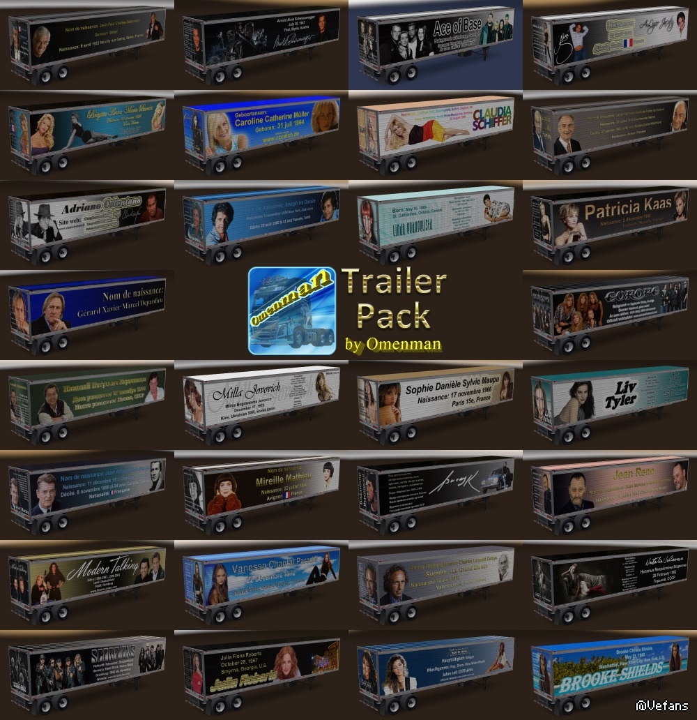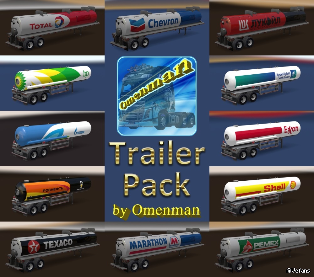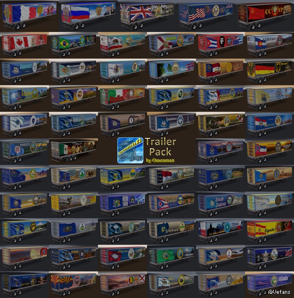 Big package of the trailers with skins from Omenman. In the package 41 company, 70 cargo and 311 skins on 6 trailers (Box, Curtain, Reefer, Reefer3000r, Gas and Acid). This package merges 9 thematic mods and 2 trailers: – Trailer Pack Cars ver.1.02.00 (50 trailers) – Trailer Pack Clothing ver.1.02.00 (19 trailers) – Trailer Pack Electronics ver.1.03.00 (50 trailers) – Trailer Pack Foods ver.1.03.00 (48 trailers) – Trailer Pack Fuel ver.1.02.00 (12 trailers) – Trailer Pack Games ver.1.01.00 (5 trailers) – Trailer Pack Geographic ver.1.02.00 (63 trailers) – Trailer Pack Logistic ver.1.04.00 (32 trailers) – Trailer Pack Stars ver.1.04.00 (30 trailers) – Trailer “Omenman” ver.1.03.00 – Trailer “Istok” ver.1.03.00 Changes in version: 1. Added trailer “Istok” 2. Added 10 trailers from mod “Trailer Pack Foods 1.03.00”: – Starbucks – Subway – Taco Bell – Karusel – Kopeyka – Lenta – Perekrestok – Polushka – Pyaterochka – Yarmarka In the archive 2 files: 1. Base: trailer_pack_by_omenman_xxxxxxx.scs 2. English version of cargo: cargo_pack_by_omenman_eng.scs Modload order: cargo_pack_by_omenman_eng.scs trailer_pack_by_omenman_xxxxxxx.scs For the Russian version, connect only file the base. All trailers are autonomous and included in the traffic. For version 1.28 - 1.31