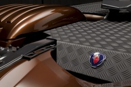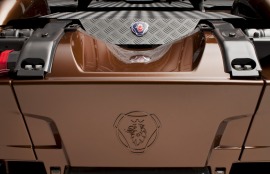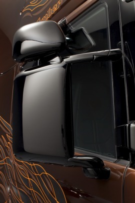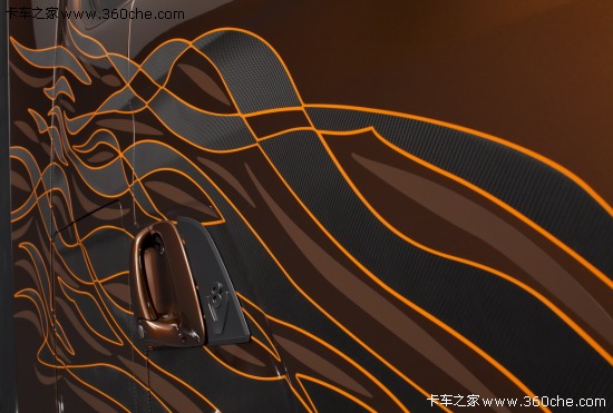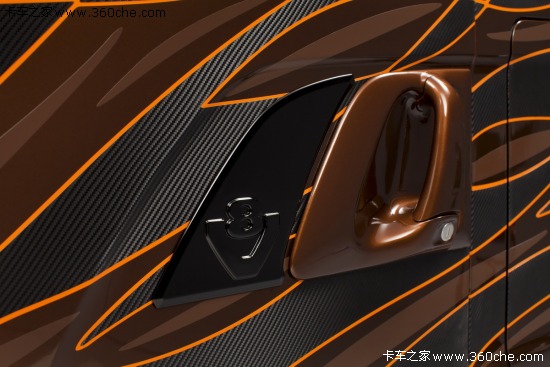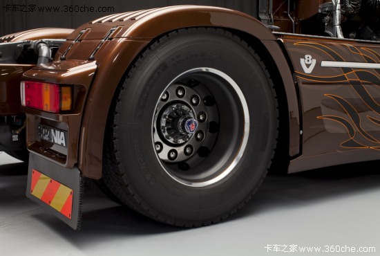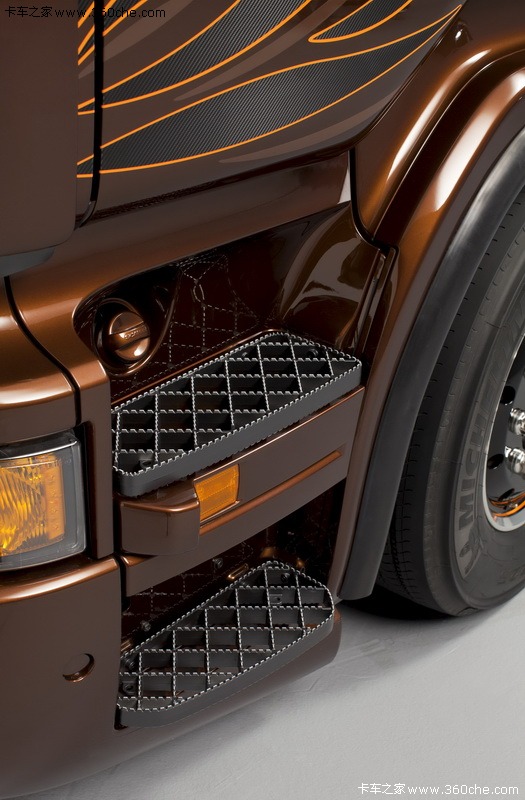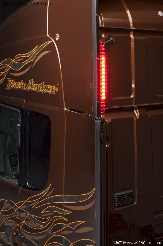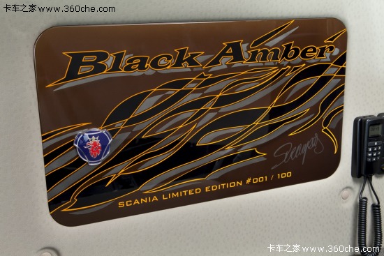 该系列限量版车型取名为“Black Amber”,中文直译过来就是黑琥珀的意思,在2009年斯堪尼亚也曾推出过“Dark Diamond”(黑钻石)限量版,这次斯堪尼亚也是选择继续和Svempas改装厂合作,Svempas是一个在瑞典具有传奇色彩的改装厂。这款斯堪尼亚的销售是面向全球用户,不过总共限量只有100台。琥珀是数千万年前的树脂被埋藏于地下,经过一定的化学变化后形成的一种树脂化石,这款车采用醇厚的琥珀色涂装,也是其百年历史的文化积淀,显得非常的稳重。同时,车身上配有跳跃的火苗图案,再配以金黄色的边框,又极具动感。斯堪尼亚Black Amber限量版将这两种独有的气质完美的融合在了一起。