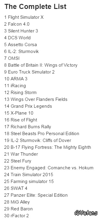 11. iRacing:開發及出版商 iRacing.com 。為一極度擬真的線上賽車遊戲。iRacing.com在北美擁有極大的市場知名度,其專業的雷射測量技術可將各大知名賽道真實呈現在遊戲當中,也因此獲得許多專業賽車手的愛用,透過其遊戲訓練賽車技術。STEAM之購買方式為包月制。