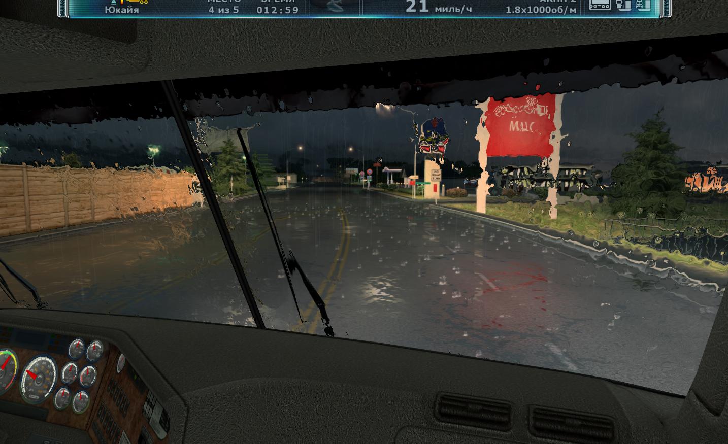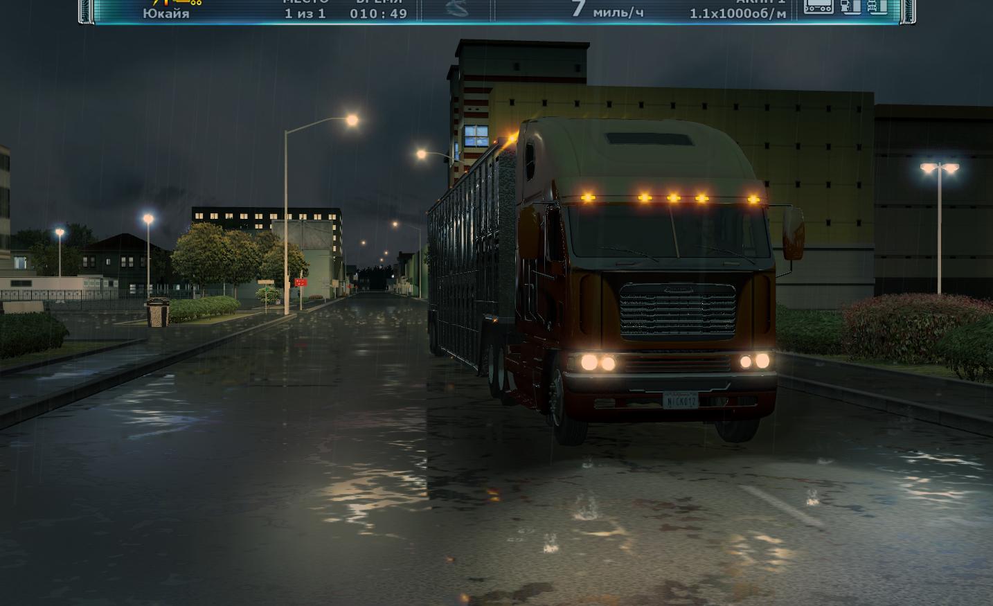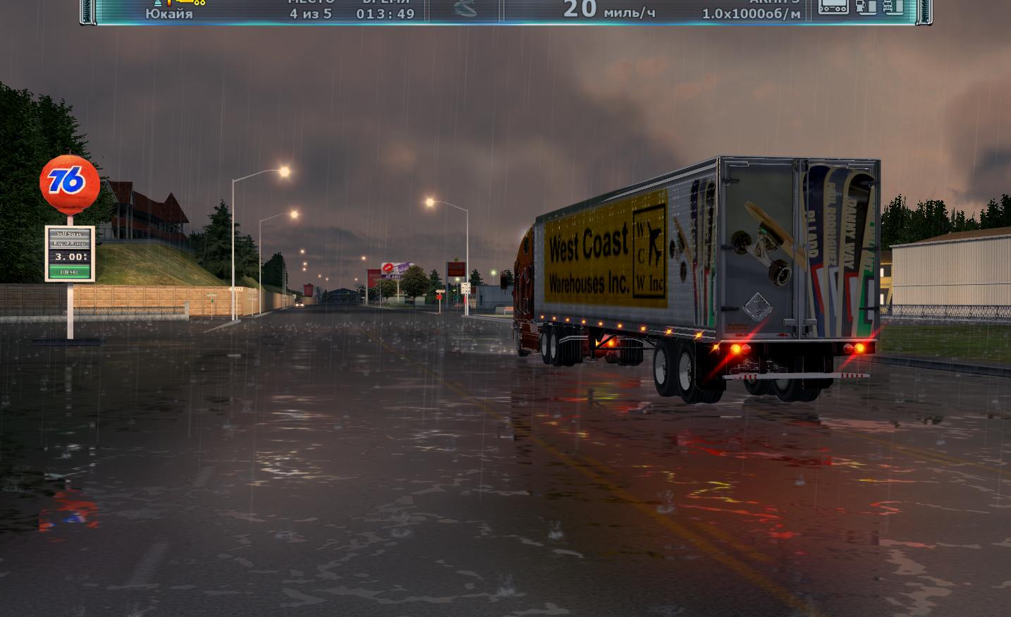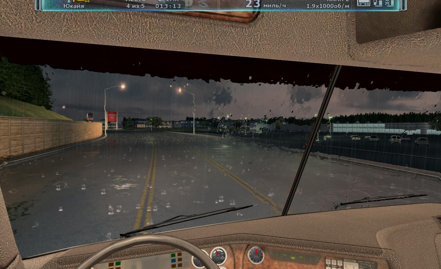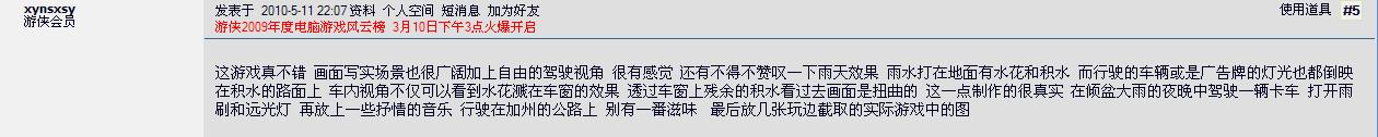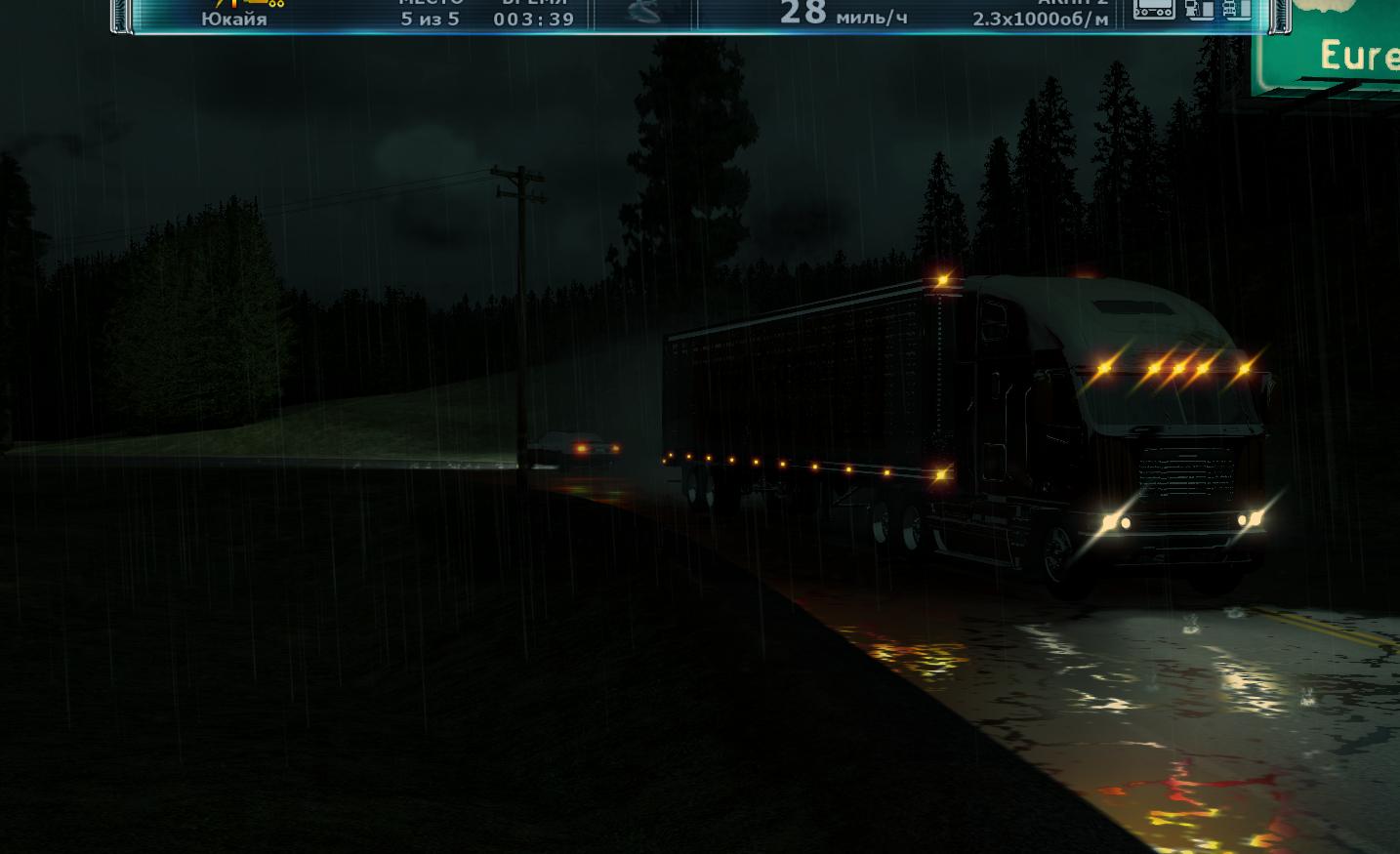 这游戏真不错 画面写实场景也很广阔加上自由的驾驶视角 很有感觉 还有不得不赞叹一下雨天效果 雨水打在地面有水花和积水 而行驶的车辆或是广告牌的灯光也都倒映在积水的路面上 车内视角不仅可以看到水花溅在车窗的效果 透过车窗上残余的积水看过去画面是扭曲的 这一点制作的很真实 在倾盆大雨的夜晚中驾驶一辆卡车 打开雨刷和远光灯 再放上一些抒情的音乐 行驶在加州的公路上 别有一番滋味