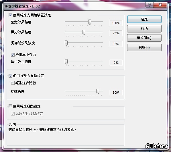 在驱动中总体力回馈效果设为100,弹力效果、减震效果、中心弹力这3项均为零(玩其他游戏也是这样设置的),方向盘转角900度