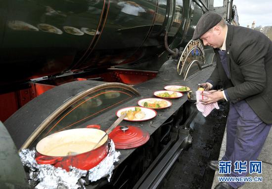英国一位老司机边开火车 边用蒸汽机烧饭