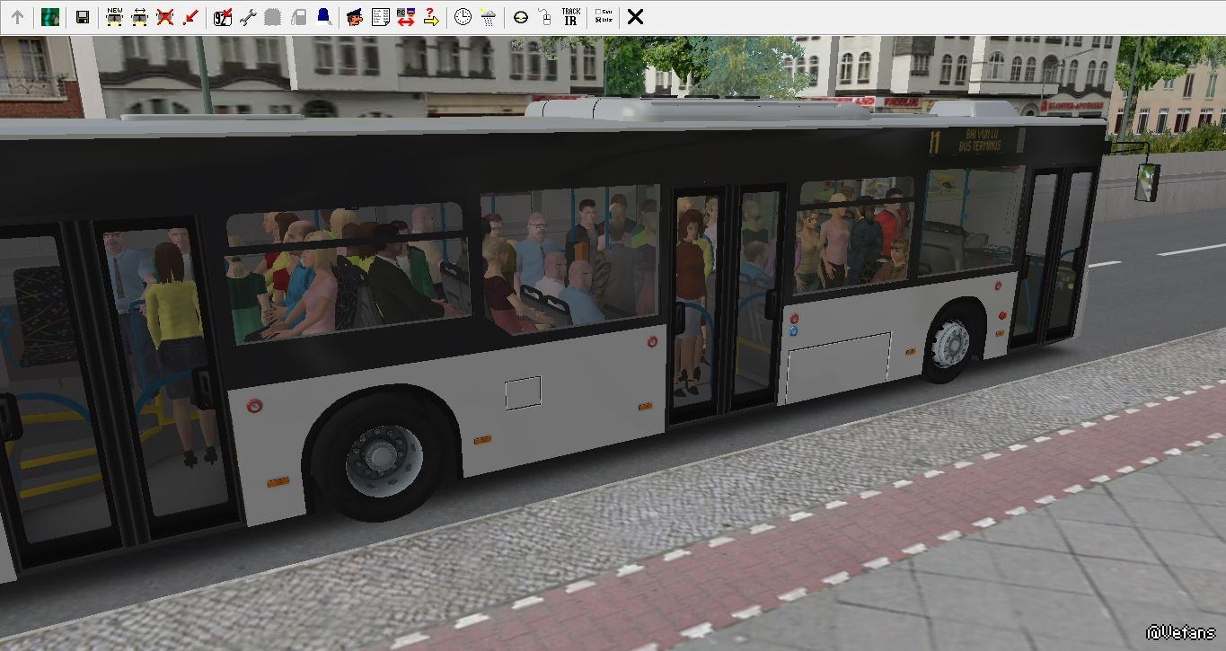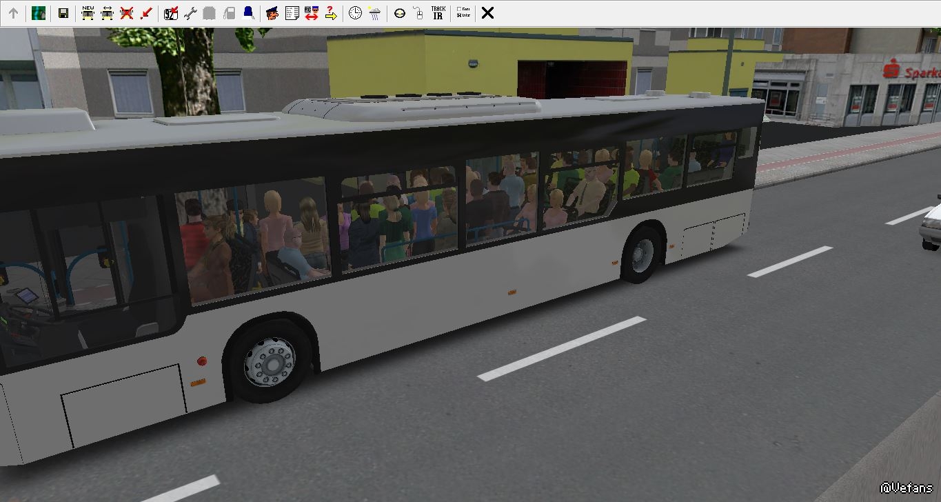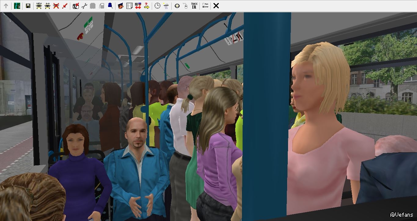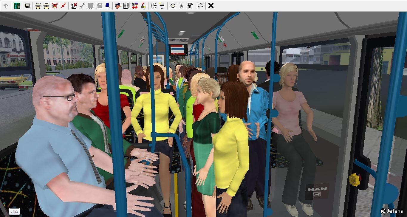 man lion's city是我非常喜欢的一辆车,但是原车的站位太少,导致载客量很低。之前有人做了2版站人补丁,第一版补丁的bug是乘客下车的位置很混乱,第二版补丁的bug是下车铃不正常(始终亮起,下客门无法自动关闭,导致下客门自动开闭的功能无法使用,必须手动开关门)。因此我自己在原版的基础上对站位进行了修改,图中黑色圆圈是座位,蓝色圆圈是原版站位,红色圆圈是我修改后的站位。修改后站位38个(基本已经摩肩接踵),座位31个,载客量70人,算是比较正常的水平了(毕竟这车过道太窄,不能站双人),且下车铃正常运作,可使用自动开闭下客门的功能,对于我这种懒得看下没下完的司机来说很方便。
