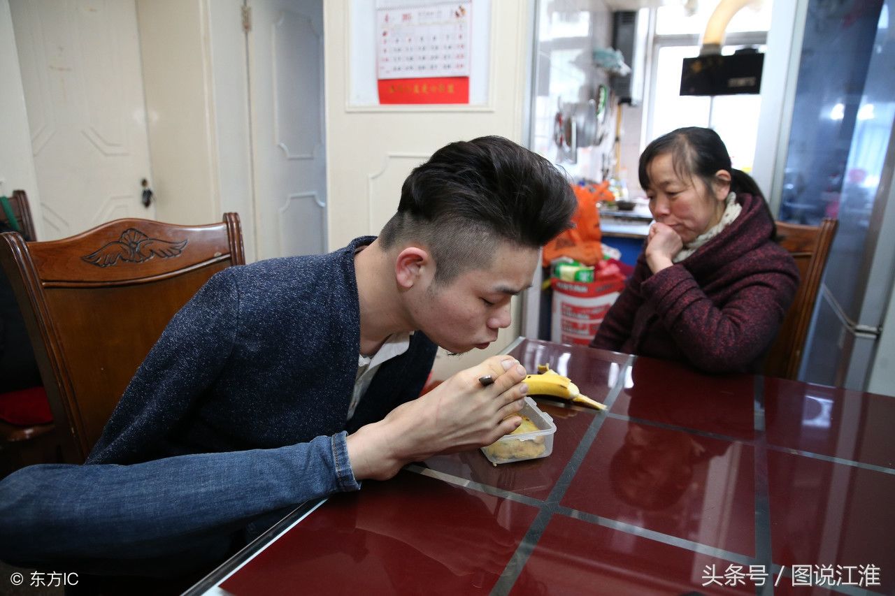 26岁的刘凯健在家里用脚吃饭,妈妈在一旁陪伴。在他上小学时因触电事故失去了双臂和左腿。面对不幸,他没有放弃,在亲人朋友的帮助下,自强自立的他用仅剩的右脚,学会了洗脸、刷牙,还重返课堂,夹起画笔,追寻自己的梦想。后来考上了江苏南通农院动漫与设计专业,此后几年,他先后在北京、深圳、四川等地参加画展,这位“90后独腿画家”先后荣获“南通十大青春榜样”“中国大学生自强之星”等荣誉称号。(图片来自东方IC)
