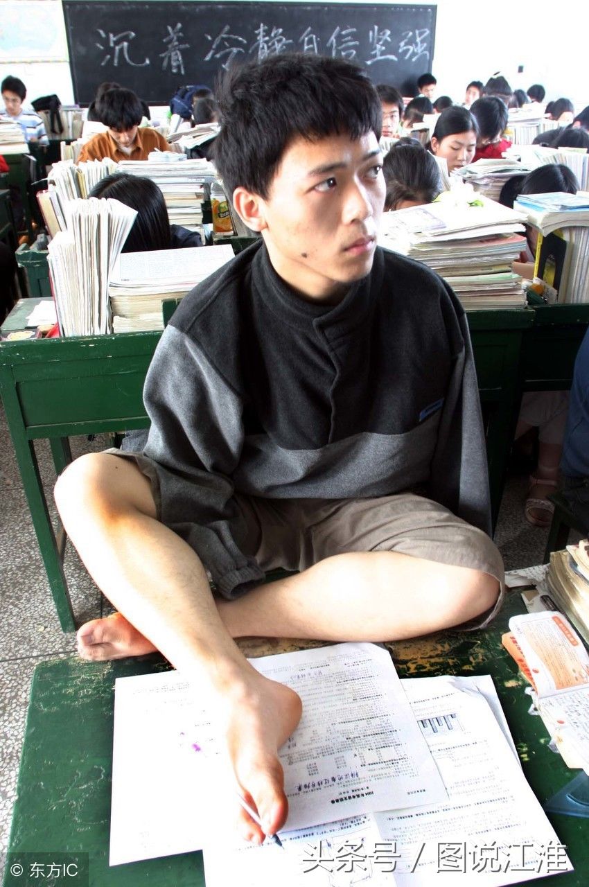 14年前,距离当年高考仅剩两天的时候,武汉市新洲区三中应届高中毕业生,无臂少年张圆分秒必争,向高考发出最后的冲刺。失去双臂的他,靠双脚用笔答题,在教室里,因为他的坚强,也感染着其他同学。(图片来自东方IC)