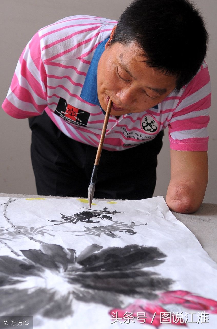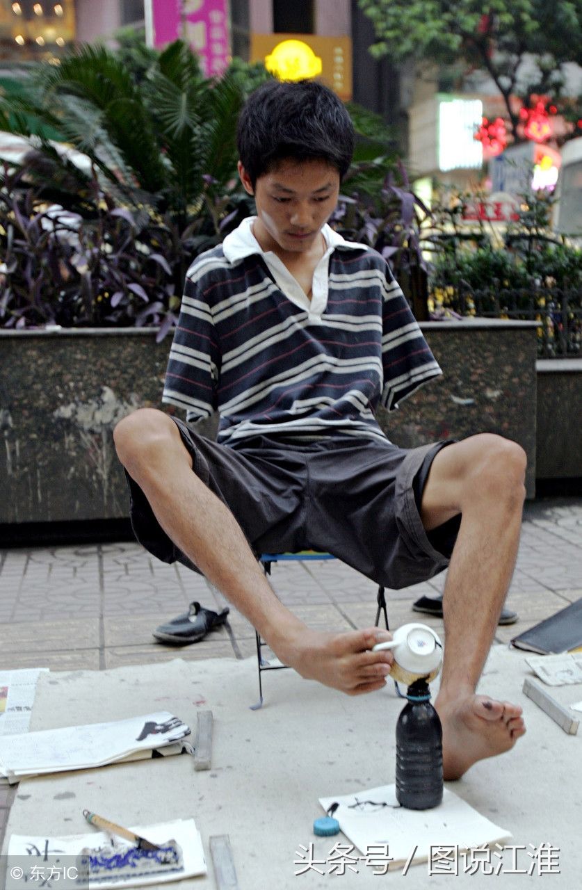 无臂男人,用脚和嘴自食其力生活,每一张图都是一个男人的一生,还是“90后独腿画家”;用自己的脚和嘴,写出了一个强大的人生,用自己坚韧的姿态告诉世界,像个男人一样,去勇敢的生活。2016年5月21日,湖南90后无臂青年刘能在深圳街头写书法,靠自己的才艺自力更生。他五岁时因意外触碰高压电,不幸失去双臂,他用嘴含毛笔练出比普通人更好的书法,后来考上了江苏南通农院动漫与设计专业,此后几年,他先后在北京、深圳、四川等地参加画展,这位“90后独腿画家”先后荣获“南通十大青春榜样”“中国大学生自强之星”等荣誉称号。(图片来自东方IC)