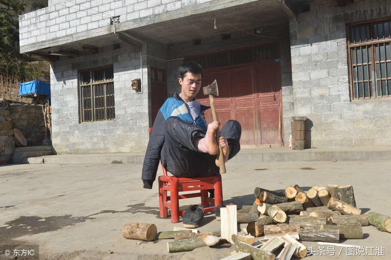 在湖北省恩施土家族苗族自治州巴东县水布垭镇鞍场村,27岁的陈兹方岀生时先天无双臂。他出生不久,父亲就离开了人世,母亲拉扯着他和哥哥艰辛度日。没有双臂的他,凭着坚强的毅力和求生欲望,学用脚代手打理生活,经过七八年的反复训练,他可以熟练地用脚写字、穿衣、洗澡、上厕所、刷牙、梳头、劈柴、割草,甚至灵巧的双脚可以穿针。初二辍学后,他先后养过猪和羊,种过烤烟,在艰难中成长。这是他在屋前用脚劈柴。(图片来自东方IC)