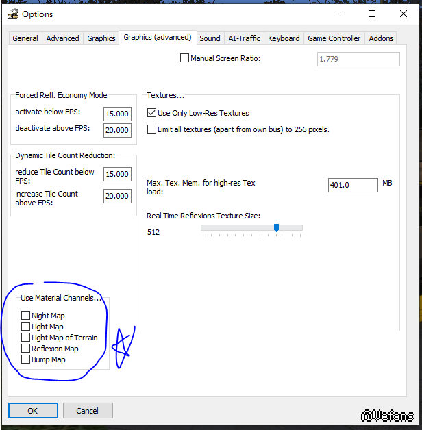 小弟用的顯卡AMD 330,也不是高配 , 小弟發現omsi的模型都是sketch up弄出來,其實這個我認為不適用於搞遊戲的,大家可以去options的進階Graphics設定,我用藍色筆圈了,我認為這個是拖慢遊戲運行的最大原因,因為bump map這些意思是令貼在景物上的材質要有質感,不是看上去一張平的紙一樣,但一般顯示卡就普通的卡要在你開車時,同時運算這些材質的光暗而做出假的立體質感,如果這個選項全都打勾,在玩OMSI時會很卡,本人就全關,暫時感覺比較順,但首先說明這個只是可以緩解,并不是非常順的那種,只是不會開車時突然停頓幾秒鐘的現象...