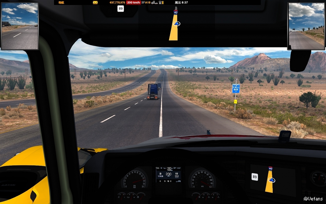 应该有二年没玩美卡了,最近放下欧卡,玩起美卡1.38,感觉美卡很好的,路网复杂,交通灯也与这边接近,但有个问题,怎么超速也不会出罚单,<交通违规>也勾了,<疲劳模拟>没勾,我也改了大马力发动机和变速器的变速比,很容易达到一百五以上,就是不开罚单,不管有没有超速摄像