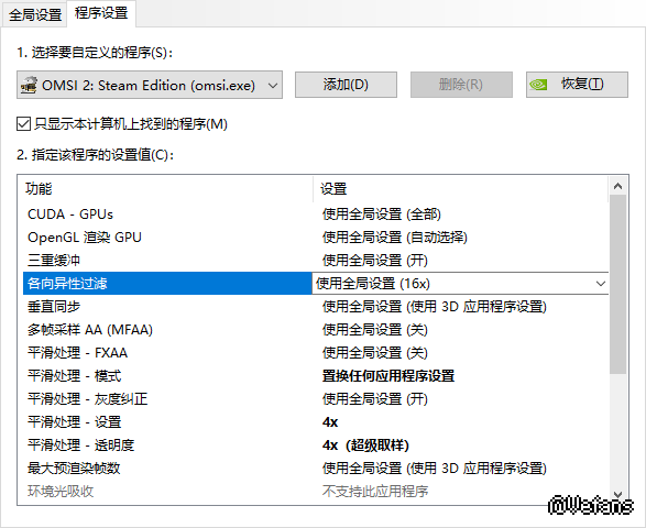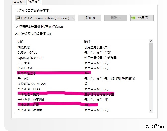 这个软件让我觉得很画面难受,而且在设置界面会花屏,又翻了翻论坛,单独给游戏设置我设置部分感觉有所改善了,但还是远处的电线成锯齿状,请大佬们推荐下win10抗锯齿的设置,不用考虑带不带得动的问题