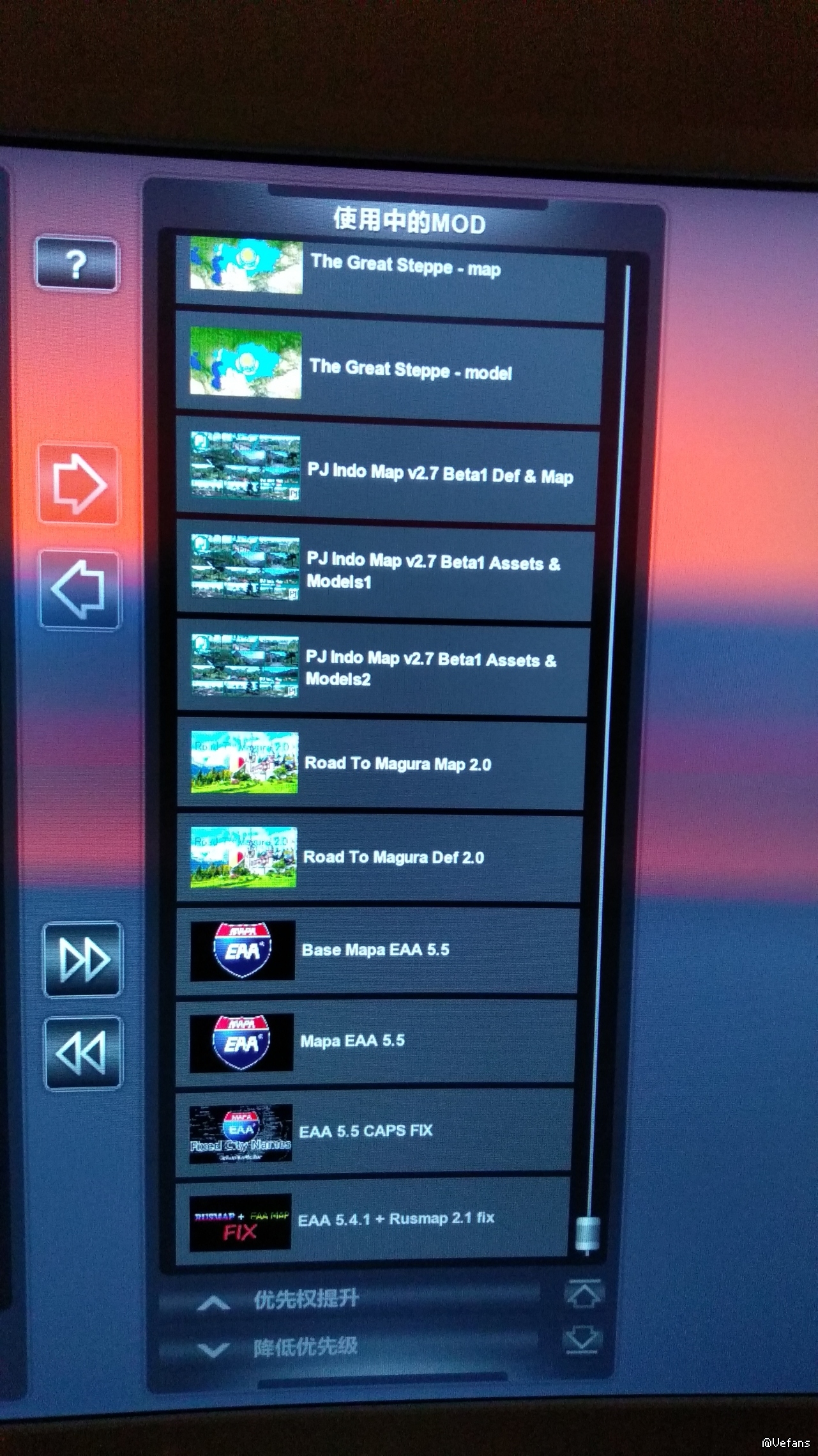 你排序太乱。出现了def定义文件在map地图文件下的情况。。还有各种补丁在地图本体排序下面的问题。EAA还缺一个和promods的链接补丁。