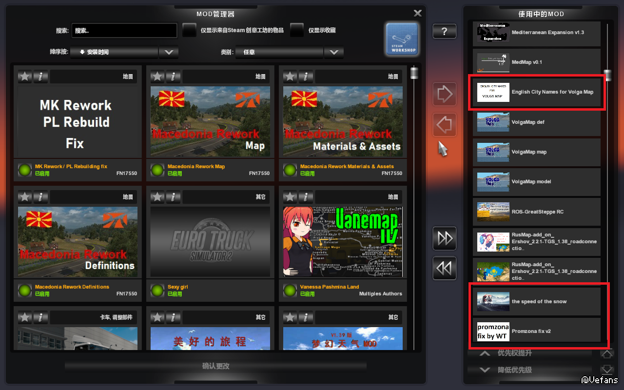 你红圈圈的几个mod,EAA那两个无所谓,只不过是南美的特种运输,上下的几个我看大部分是地名的英文化。就是把不知道什么语的地名给英语化的,也无所谓。有没有都行。还有个open border的,是以色列边境检查站的mod,也是有没有都无所谓。speed of snow,是毛子图开放空间的雪花速度的mod,更是有没有都无所谓。