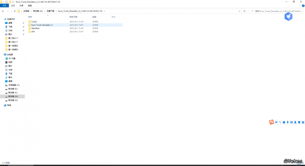 应该是自动解压了,把“Crack”里面“bin”文件夹剪切或复制到“Euro Truck Simulator 2”后,进行替换即可