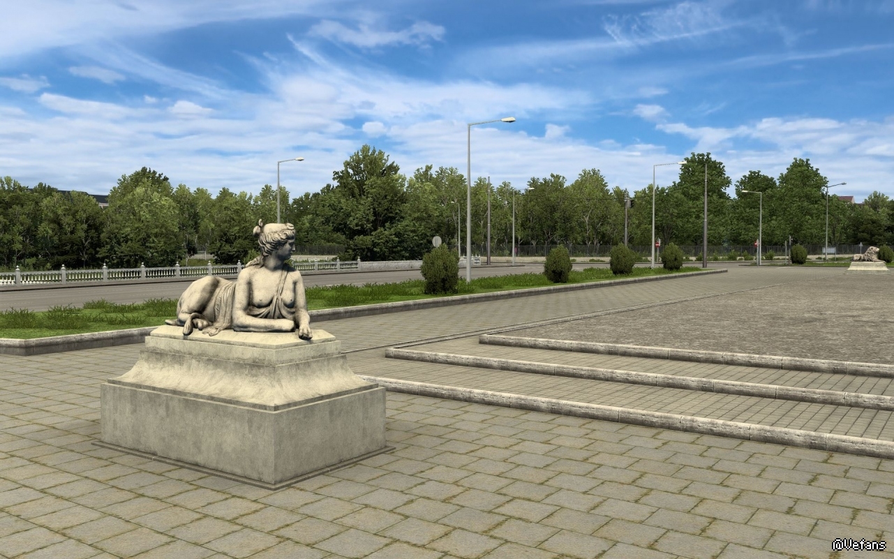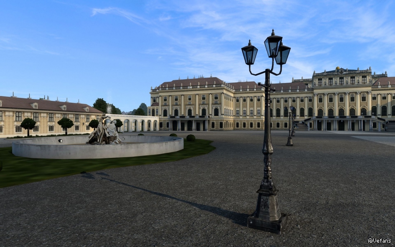 游戏里的美泉宫除了花园里面的两组雕像(其实是平面的)差一点外,整座建筑与现实中的美泉宫相似度还是比较高的。赞!