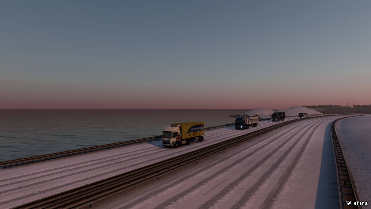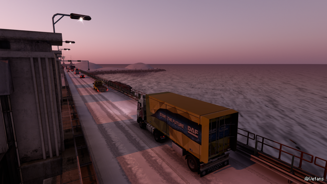 驾驶一辆DAF XD在日落时在海滨公路上的车群穿梭,主打的就是一个小~