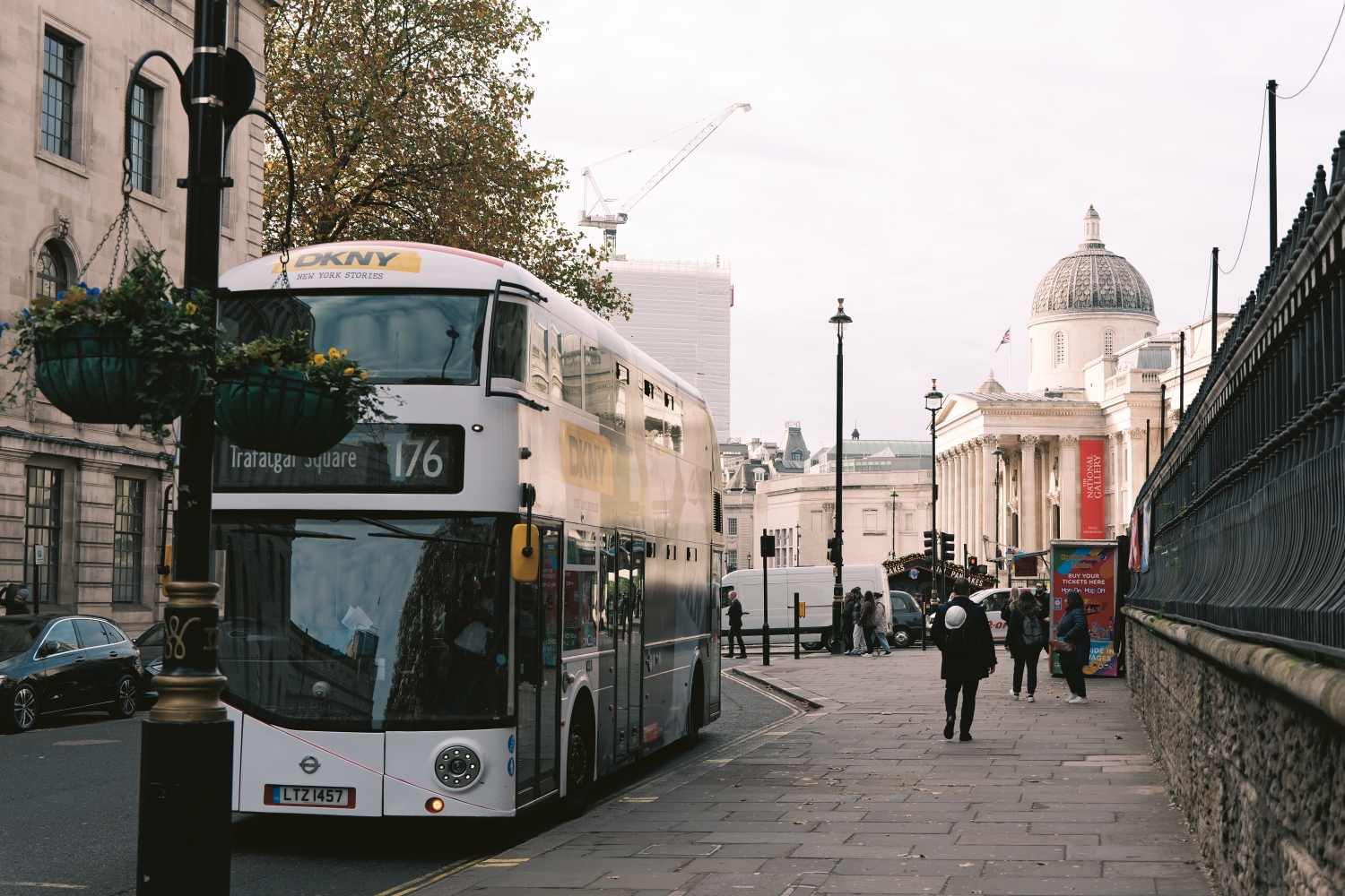 英国伦敦双层巴士在落叶时节