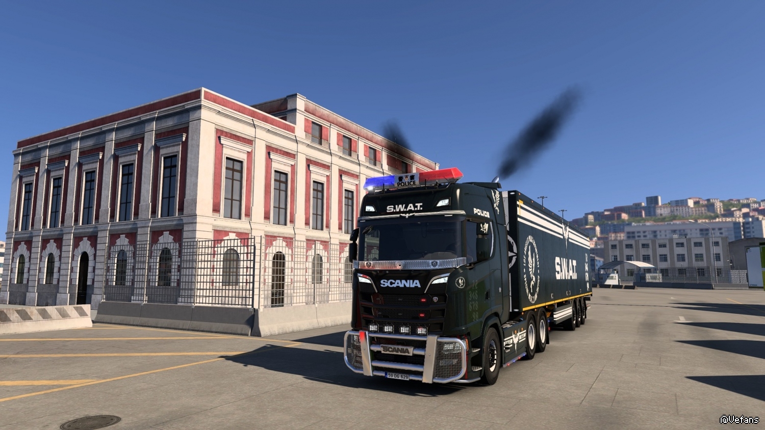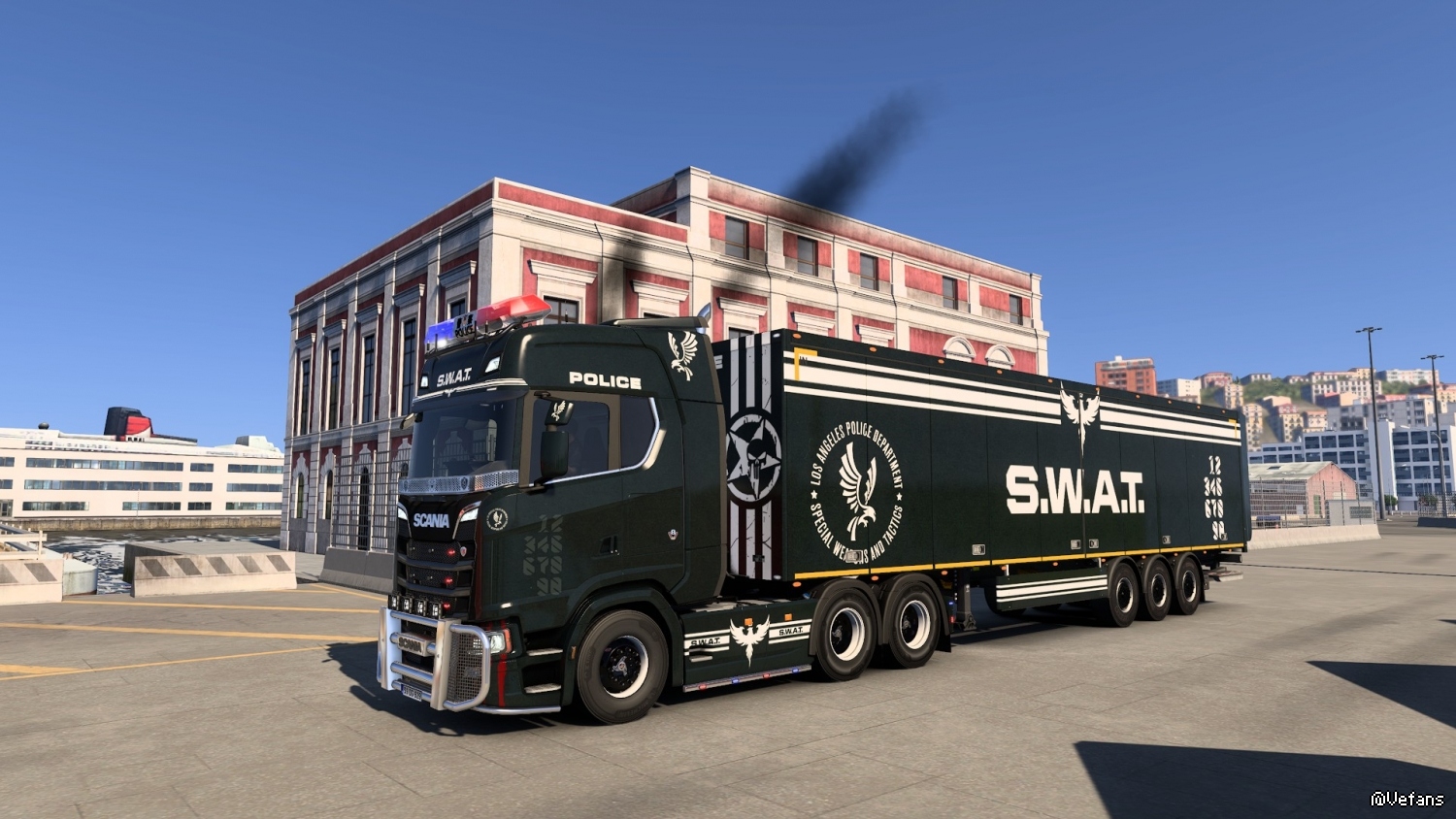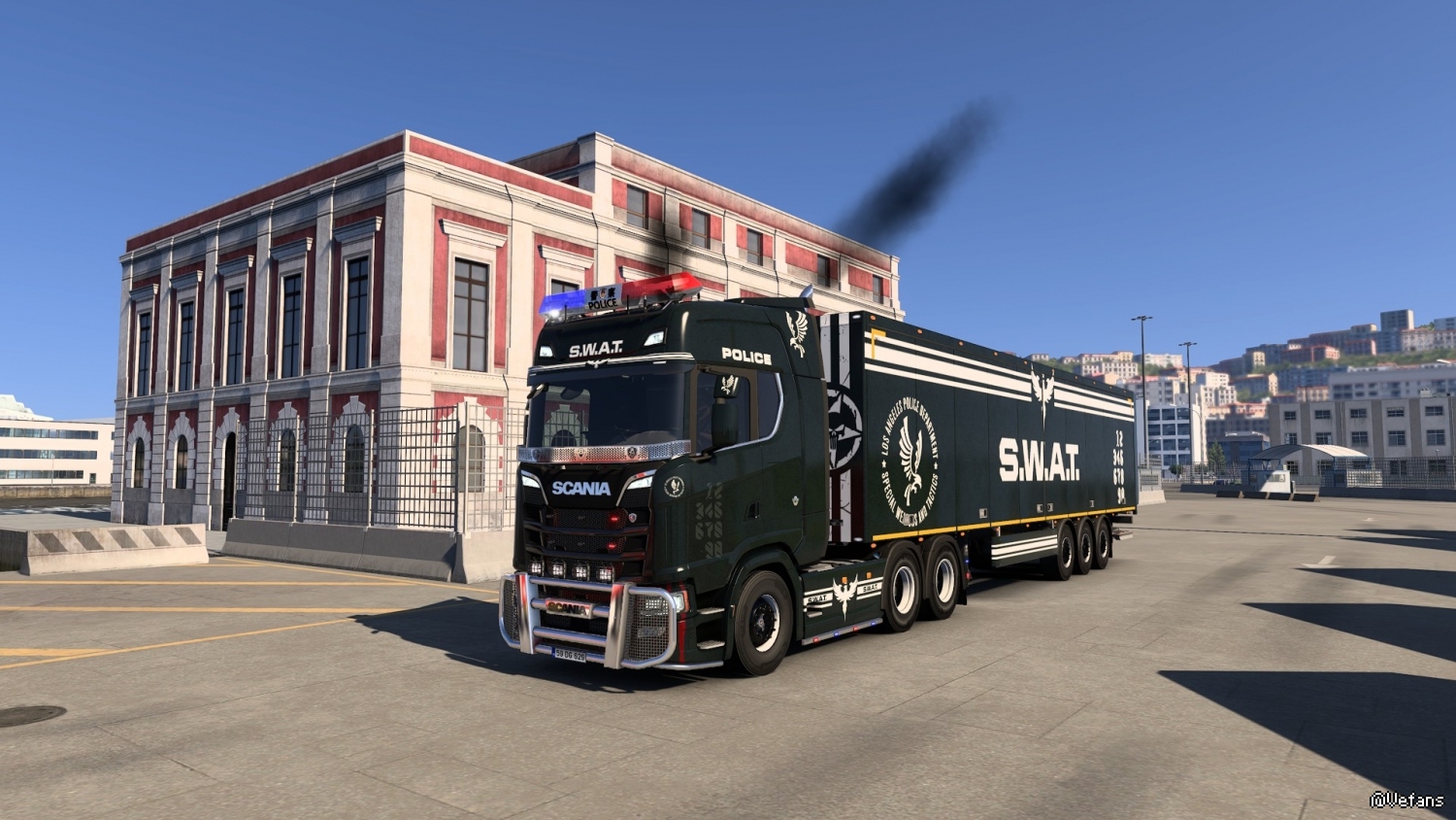 之前下了个SWAT的皮肤想找个警笛的mod,正好昨天看见了模载联合技术团队分享的警灯mod让我的卡车完美了!