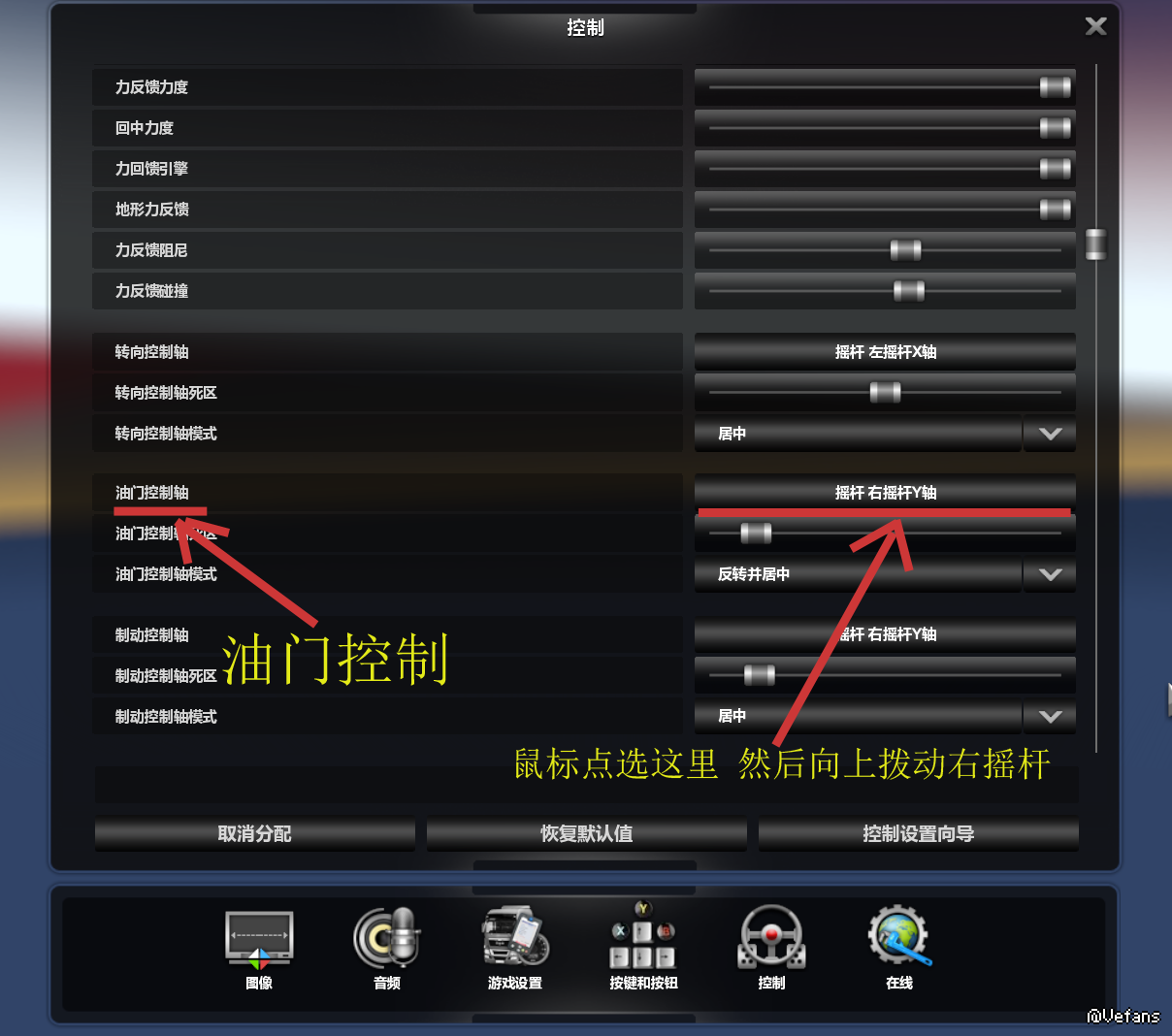 控制菜单把“力回馈”,所有的回馈力度拉到最大,卡车只有在颠簸的路面或者碰撞时才会震动,另外手柄要有震动功能。